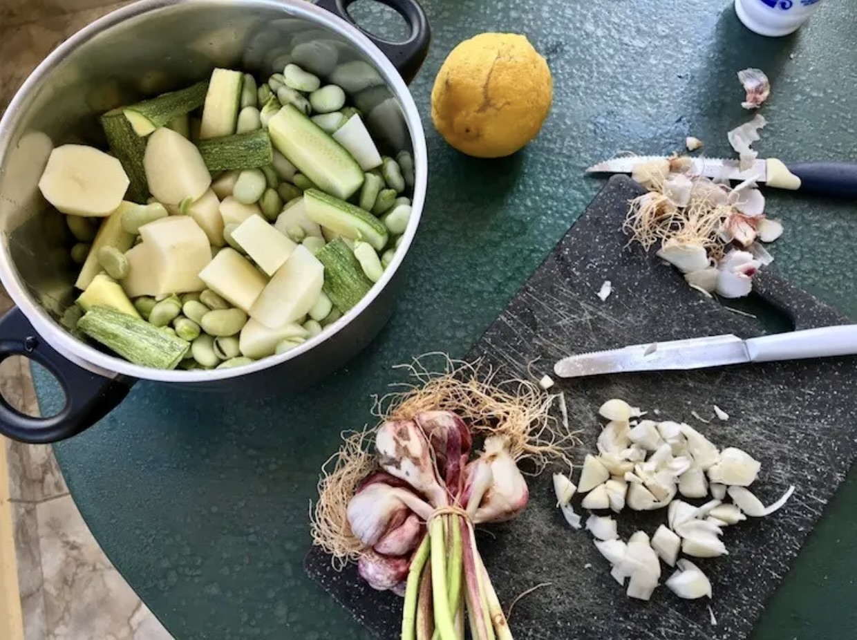 Przygotowanie warzyw: Cukinie pokrój w podłużne kawałki. Ziemniaki obierz i pokrój w grubą kostkę. Jeśli używasz bobu, obierz go (na Krecie często gotuje się go w strąkach po usunięciu włókien, ale w Polsce zazwyczaj kupujemy samy ziarna).