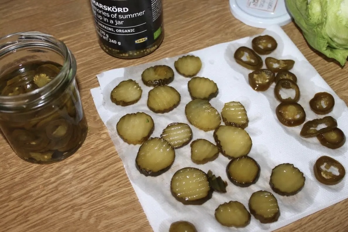 Na wierzchu ułóż ogórki z sałatki szwedzkiej i plastry jalapeño (lub chilli).