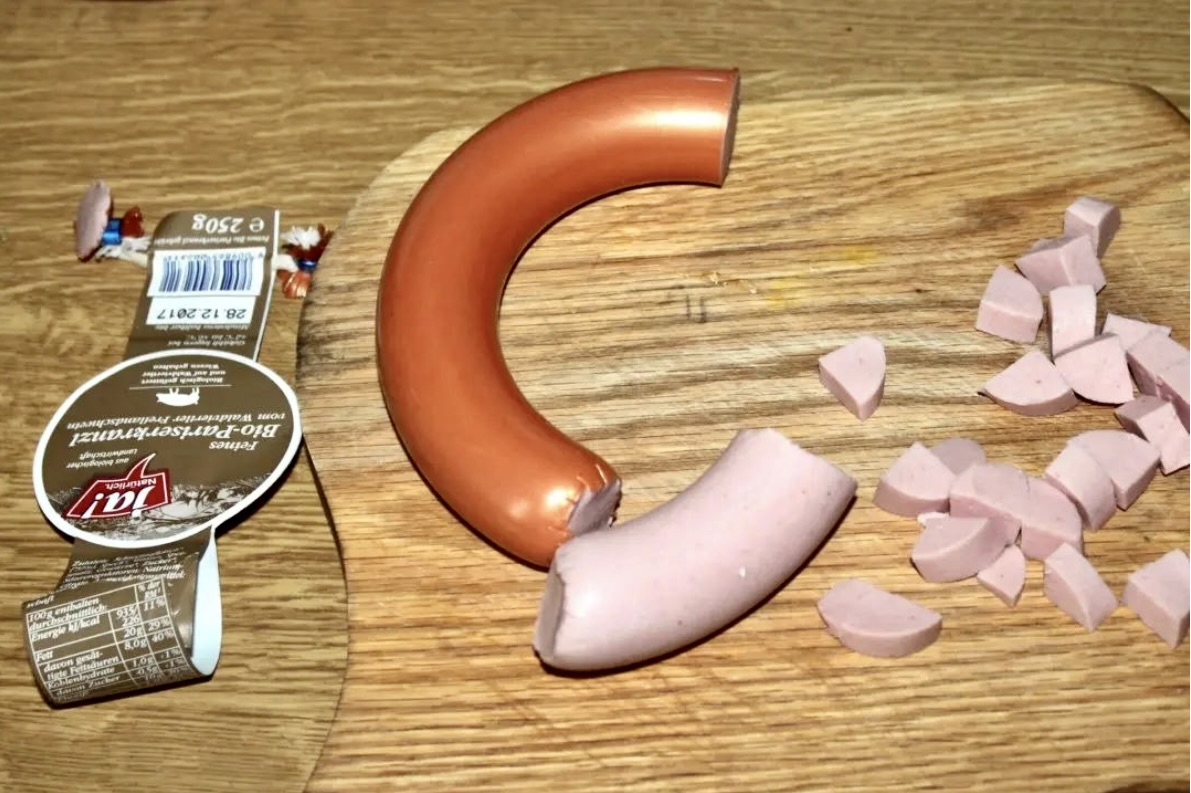 Wędlina: Parówki lub mortadelę pokrój w kostkę.