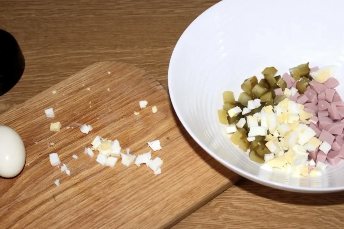 Jajka: Ugotuj na twardo (ok. 8–9 minut), ostudź, obierz i pokrój w drobną kostkę.