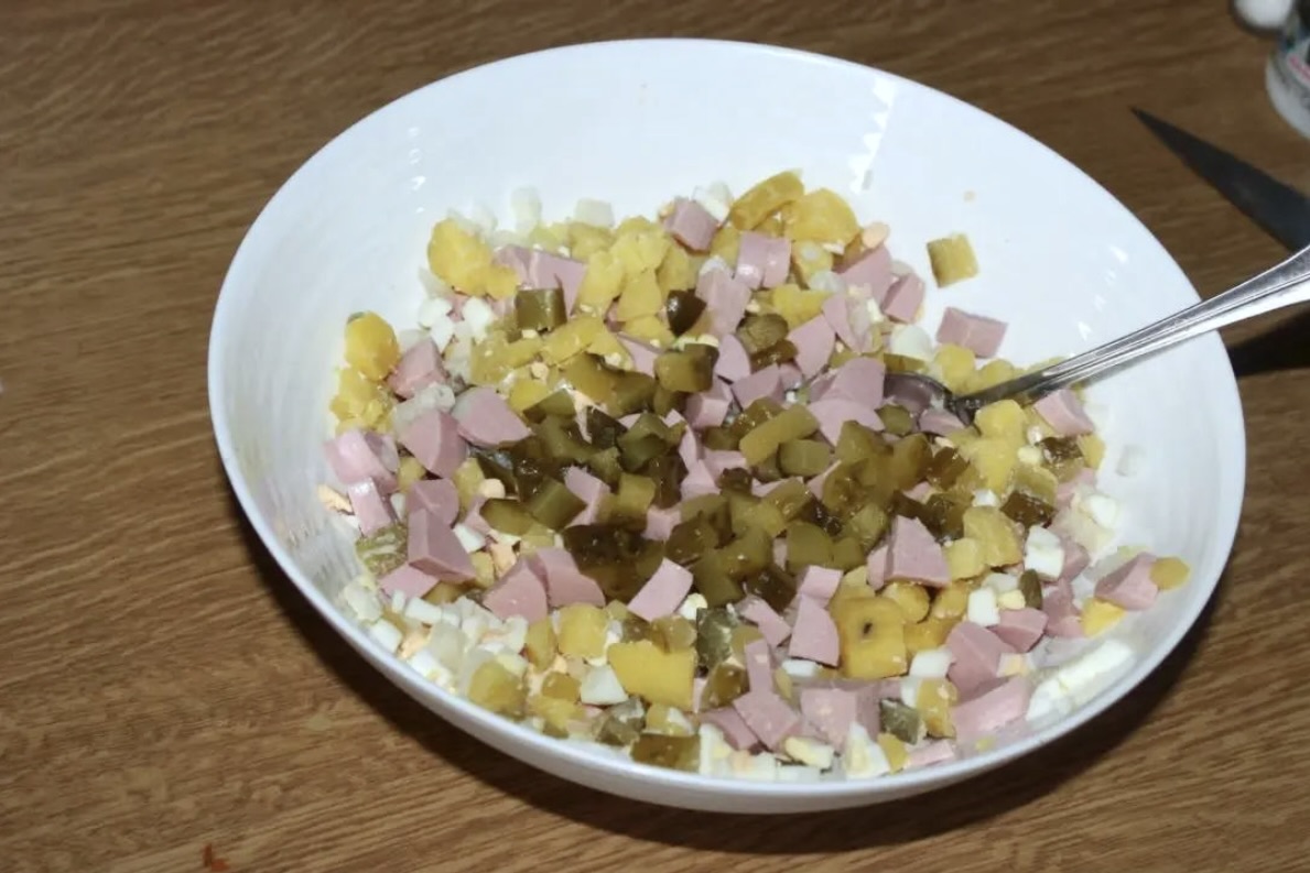 Mieszanie: Przełóż wszystkie składniki do dużej miski. Dodaj majonez, sól oraz pieprz.
