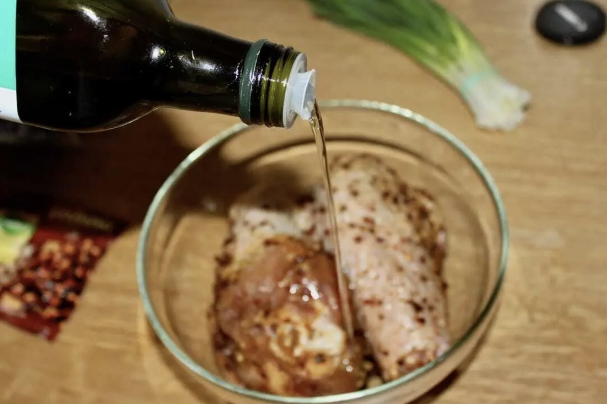 Przyprawami dobrze natrzyj mięso, włóż do miski, przykryj folią spożywczą i wstaw do lodówki na kilka godzin(minimum 30 minut).