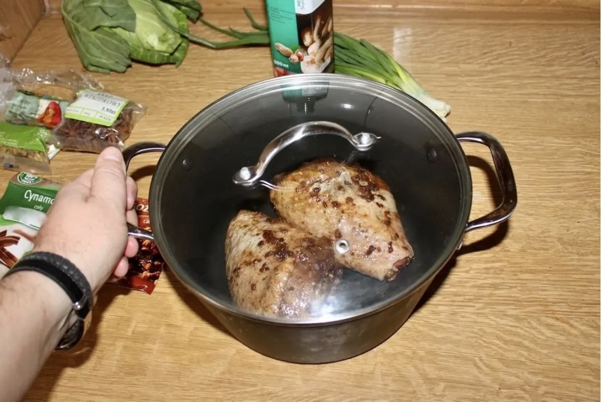 Włóż uda indycze do żaroodpornego naczynia, przykryj pokrywką i wstaw do piekarnika nagrzanego do 220°C na 15 minut. (Wysoka temperatura ma zamknąć pory mięsa).