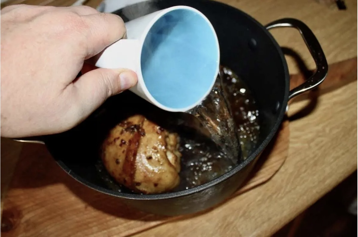 Przykryj i wstaw z powrotem do piekarnika, zmniejszając temperaturę do 180°C. Piecz mięso około 40 minut, aż stanie się dość miękkie (co jakiś czas podlewaj je sosem z duszenia).