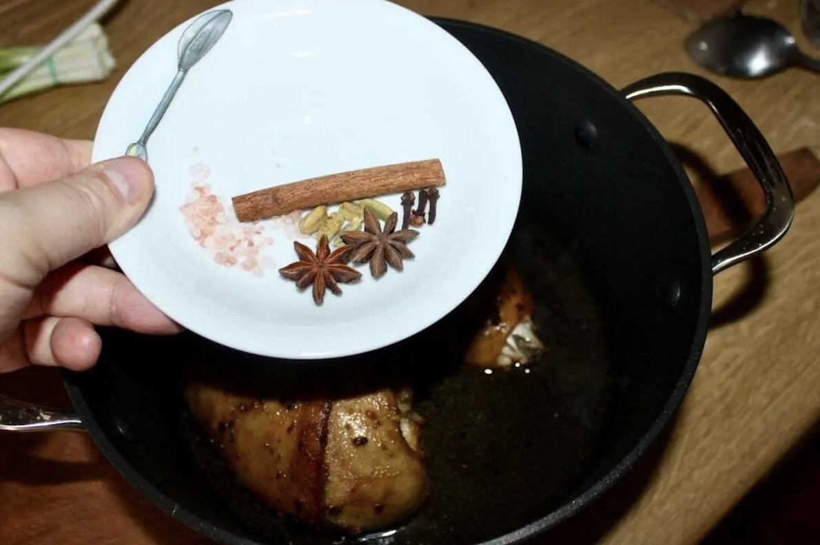 Wlej do naczynia 2 szklanki gorącej wody. Dodaj kardamon, anyż, goździki, cynamon oraz pół łyżeczki soli.