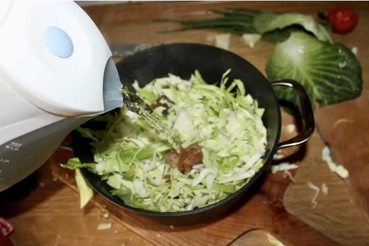 Kapustę posiekaj drobno. Gdy indyk jest już „al dente” (po około 40 minutach), wyjmij naczynie.