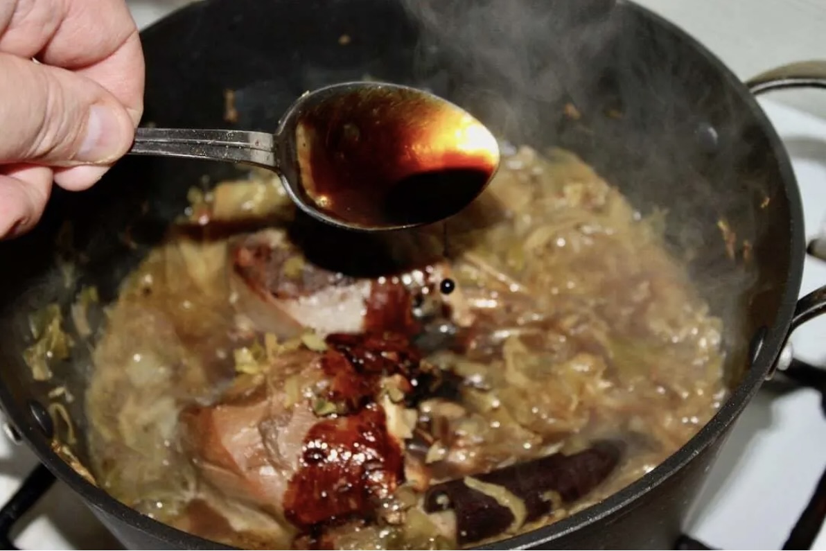 Gdy mięso i kapusta są miękkie, wyjmij naczynie z piekarnika. Przełóż je na gaz (jeśli używasz naczynia, którego nie można stawiać na gazie, przełóż zawartość do garnka).
