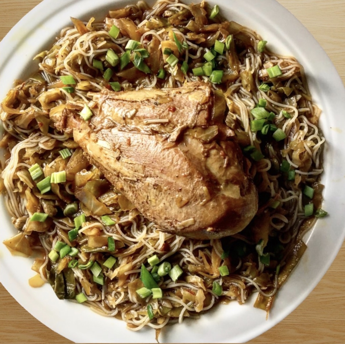 Podawaj indyka na kapuście z makaronem ryżowym, posypane posiekaną dymką.