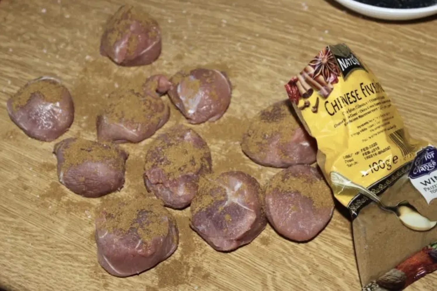Medaliony z indyka (mięso z indyczej nogi) posyp solą i bardzo obficie przyprawą „chińskie 5 smaków”.