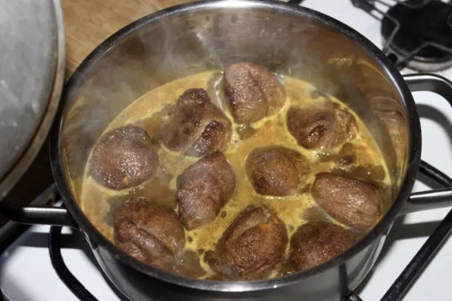Włóż do niego mięso i wyłącz gaz pod garnkiem. Trzymaj pod przykryciem, aby mięso się zagrzało.