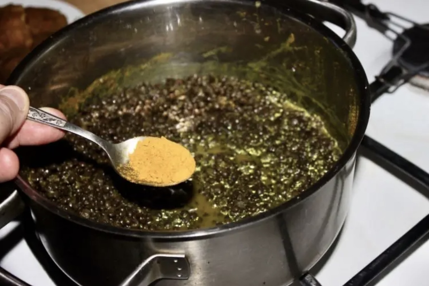 Dodaj do soczewicy łyżeczkę kurkumy (mielonej, opcjonalnie) i tyle samo przyprawy curry, o ile sos nie jest już zbyt intensywny w smaku.