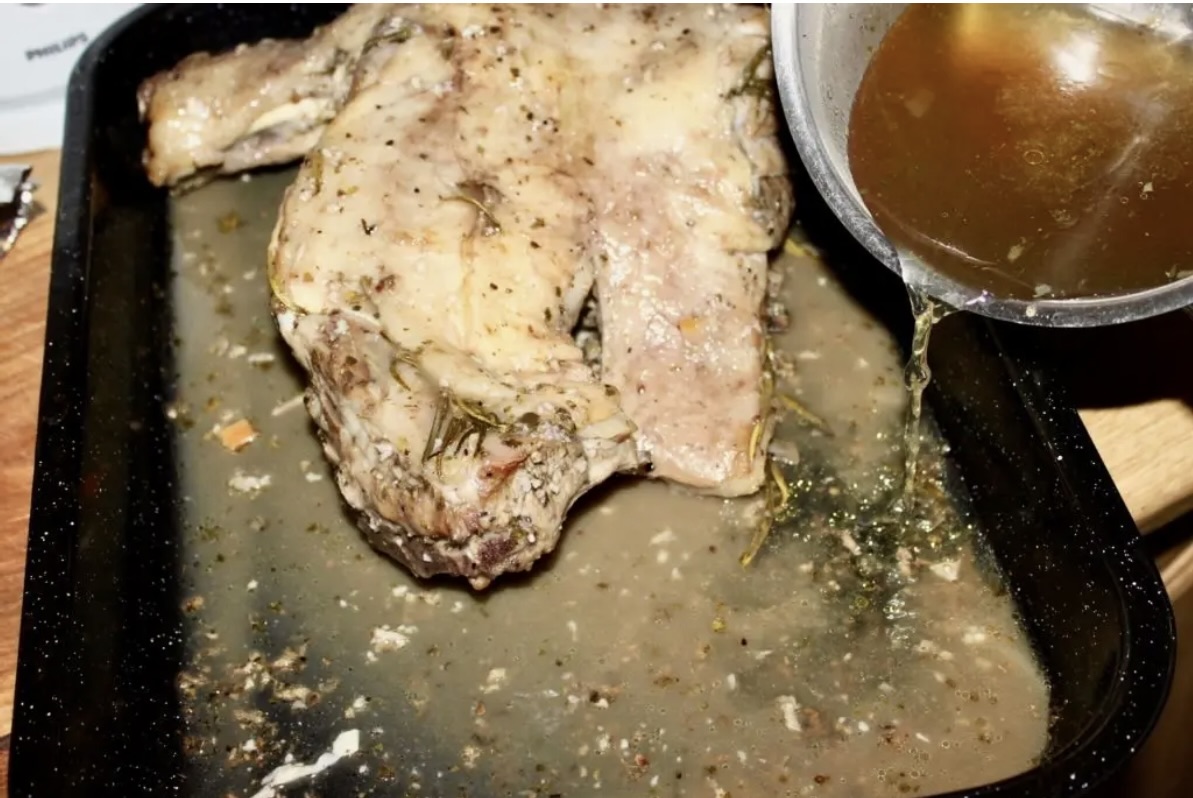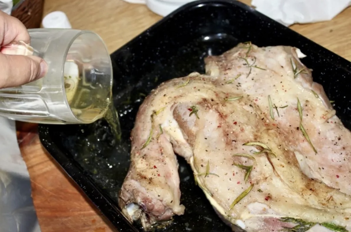Długie pieczenie: Wyjmij brytfannę, wlej na dno szklankę bulionu (lub wody), przykryj szczelnie folią aluminiową, a następnie zmniejsz temperaturę do 170°C. Piecz przez 1 godzinę.
