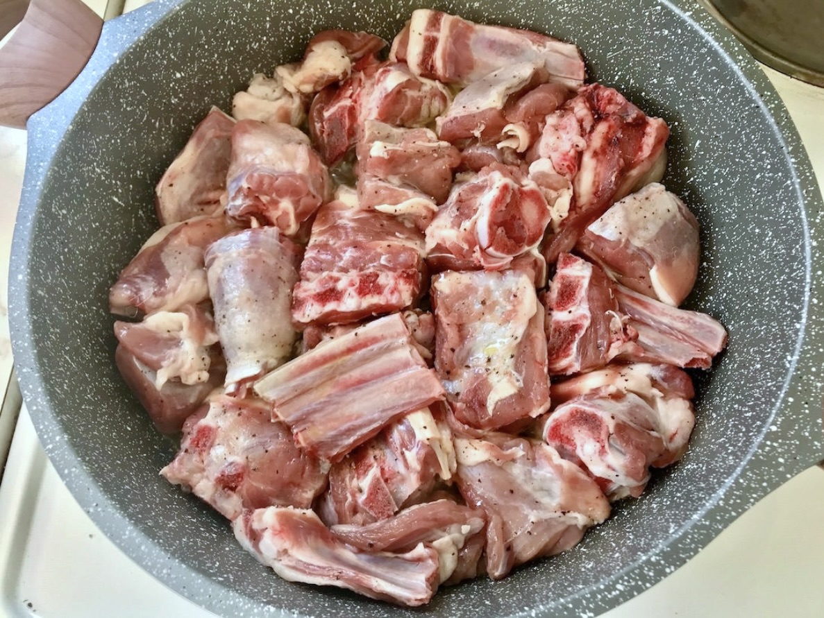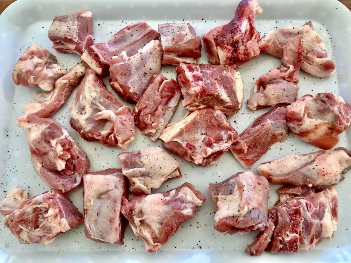 1 kg przedniej części jagnięciny mlecznej (posiekanej z kośćmi na kawałki wielkości ok. 1/3 dłoni).
