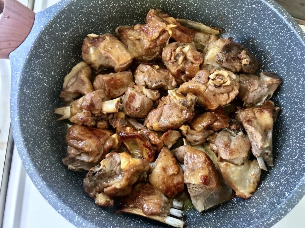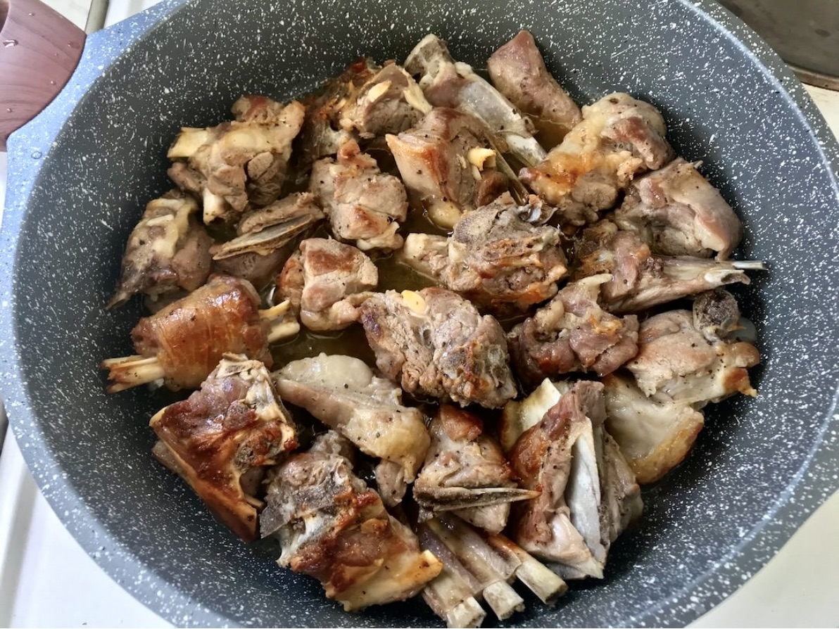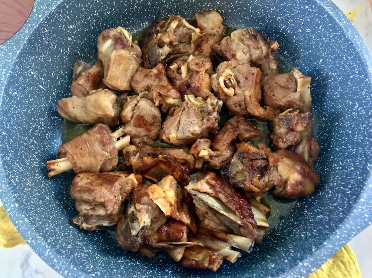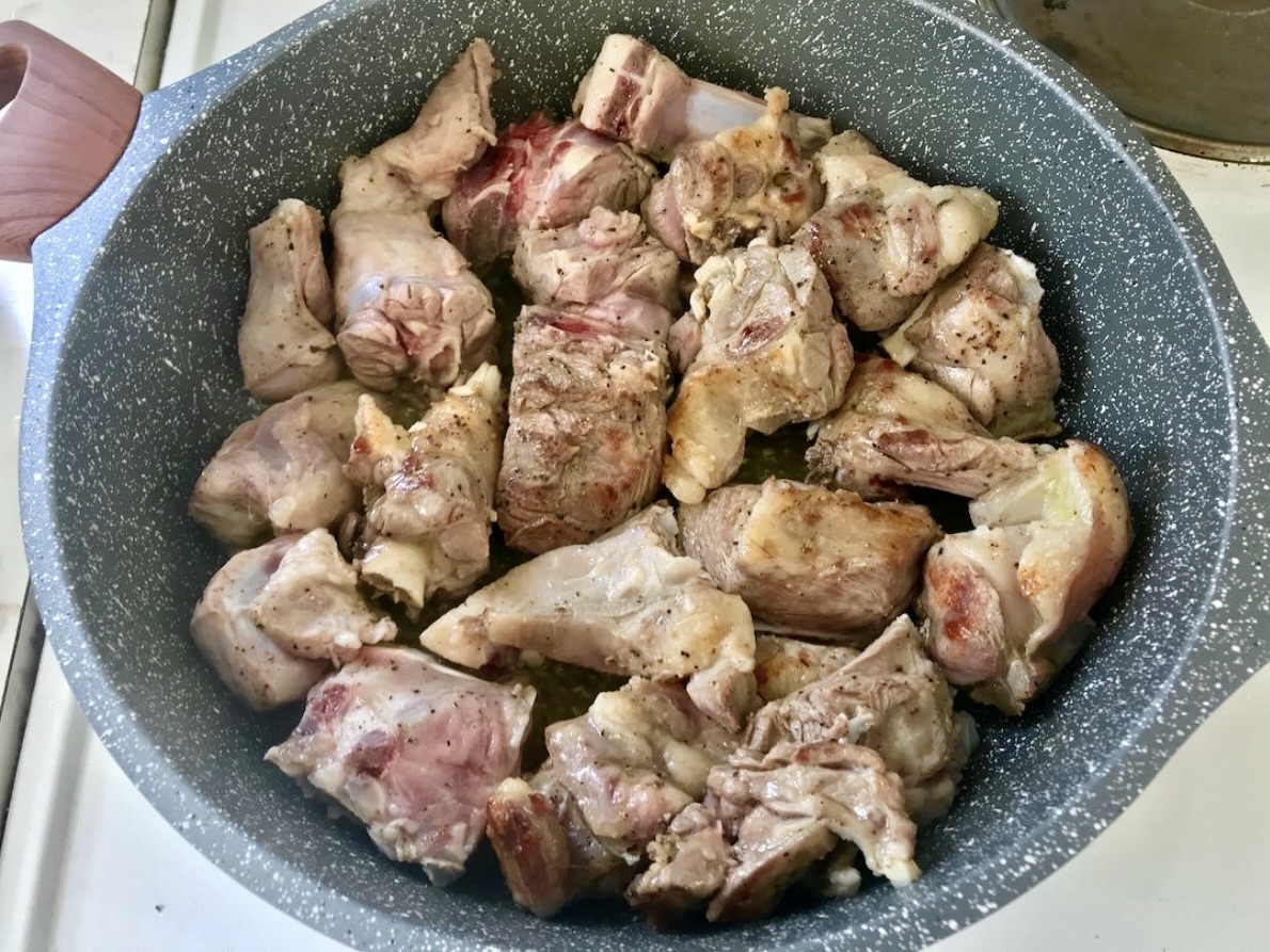 Smażenie wstępne: Wlać do szerokiego rondla lub głębokiej patelni pół szklanki oliwy (powinna zakryć dno). Gdy oliwa osiągnie średnią temperaturę, ułożyć ciasno kawałki jagnięciny.