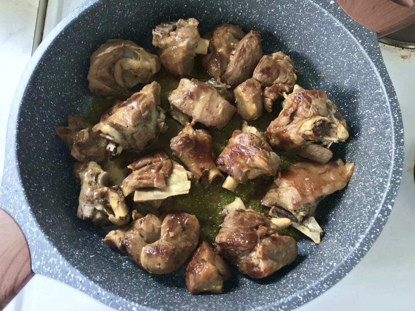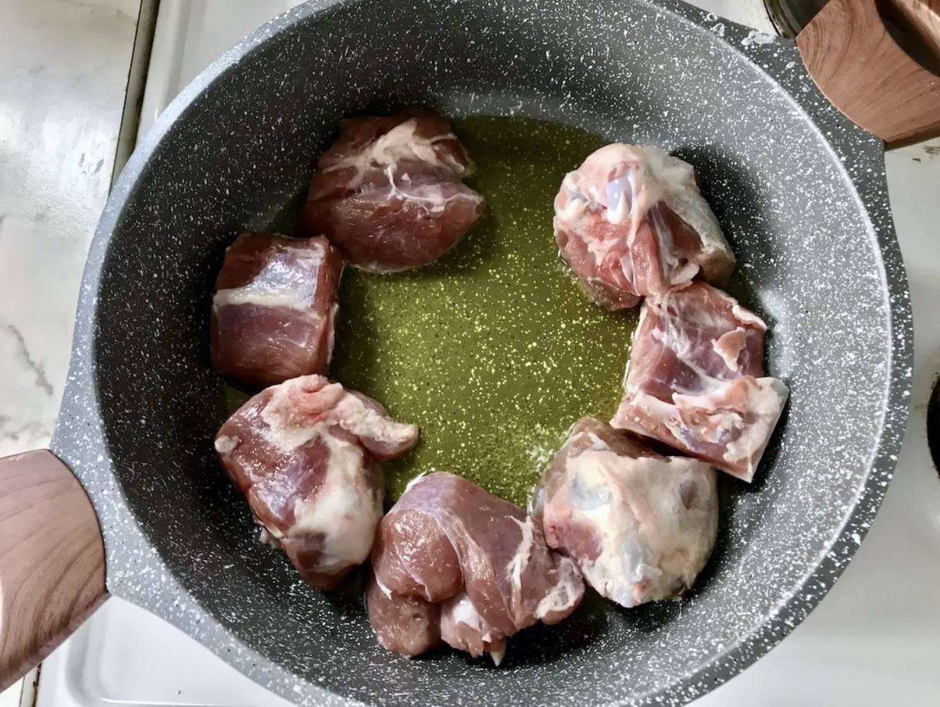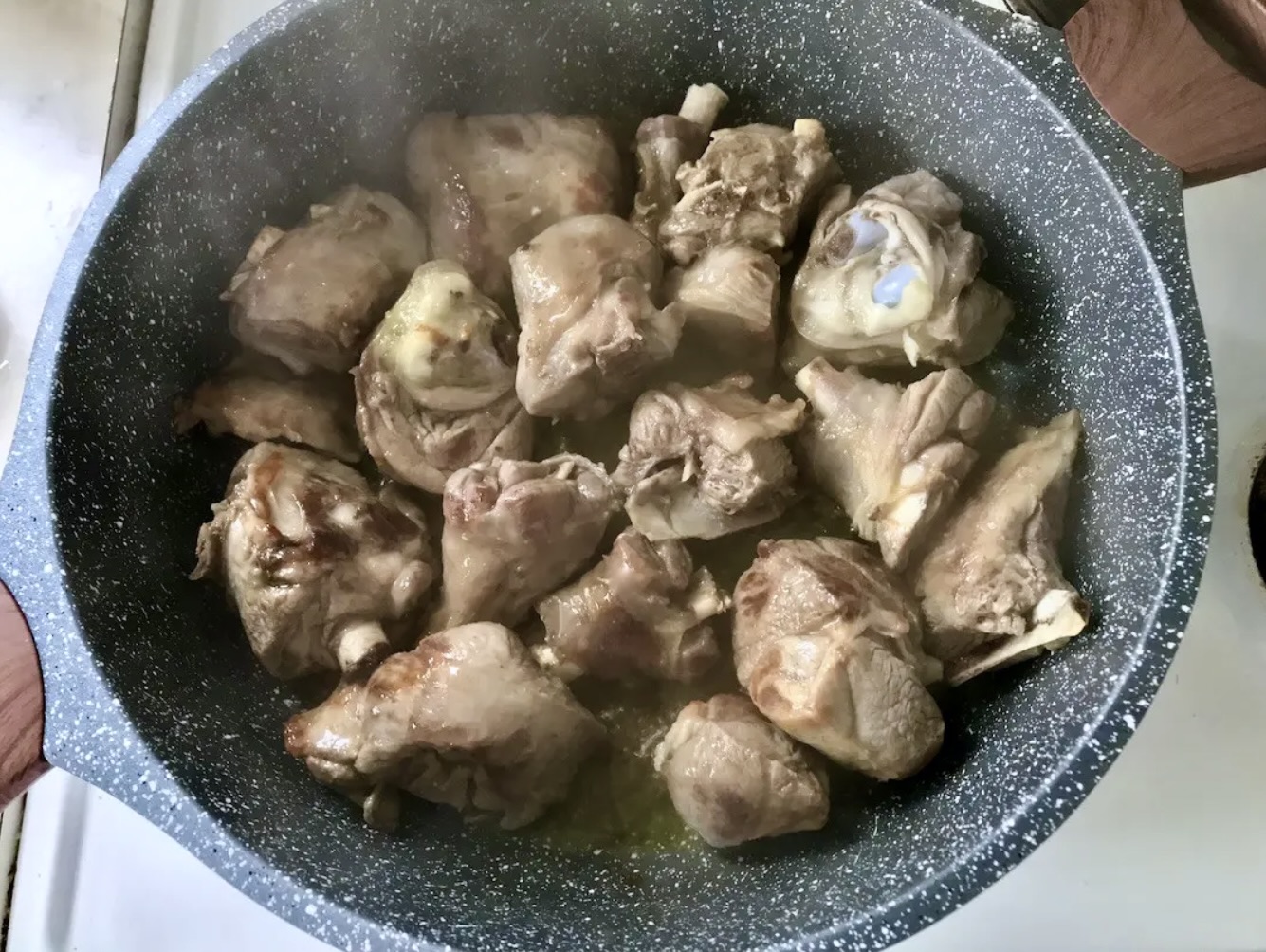 Obsmażanie: Na dużej patelni z wysokimi brzegami rozgrzej oliwę (powinna pokryć całe dno patelni). Rozłóż kawałki mięsa tak, aby każdy spoczywał bezpośrednio na dnie. Przykryj patelnię i smaż na mocnym ogniu przez 5 minut. Następnie obróć kawałki i smaż dalej bez przykrycia, aby zrumieniły się z każdej strony.