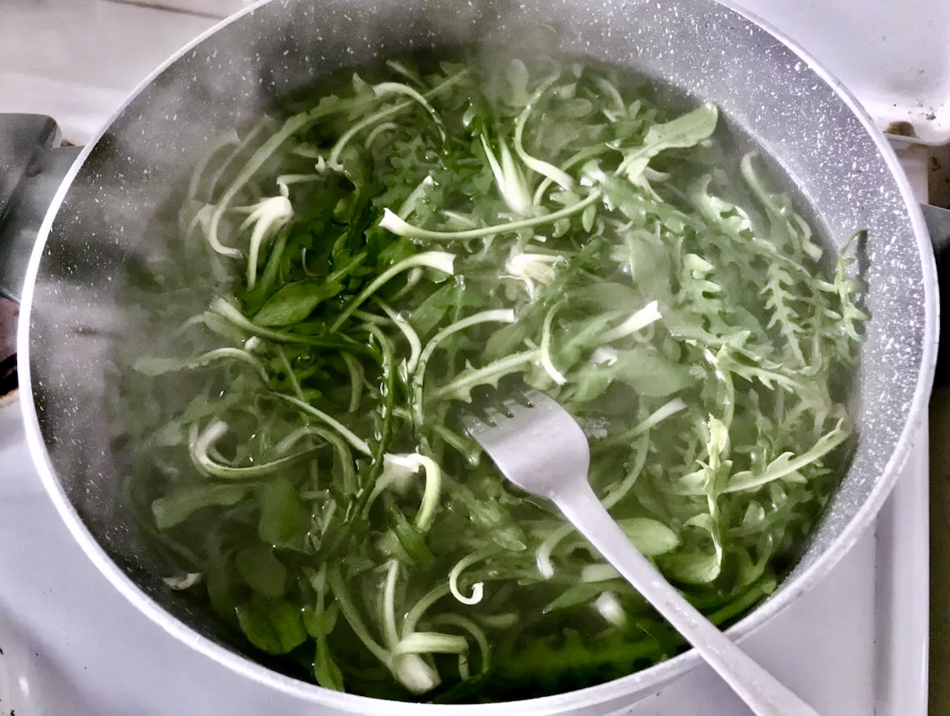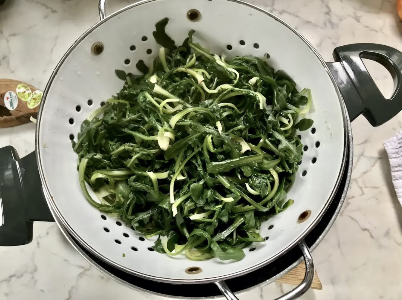 Przygotowanie cykorii: Z każdej pęczki cykorii (lub szpinaku) usuń niewielką część korzonka. W dużym garnku zagotuj osoloną wodę, a następnie wrzuć cykorię. Możesz dorzucić 2 lub 3 ziemniaki. Gotuj warzywa 10 minut, aby zmiękły (szpinak wystarczy zblanszować). Ugotowaną cykorię odcedź i pozostaw na durszlaku.