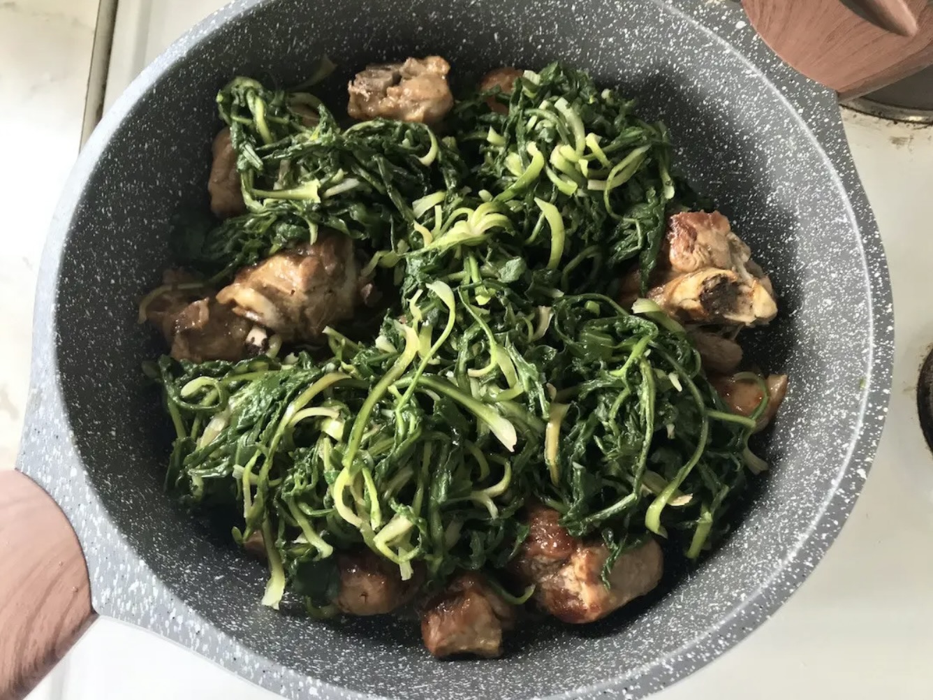 Połączenie: Po godzinnym duszeniu, gdy mięso jest już miękkie, wrzuć podgotowaną cykorię na patelnię do mięsa. Przykryj i duś ledwie kilka minut.