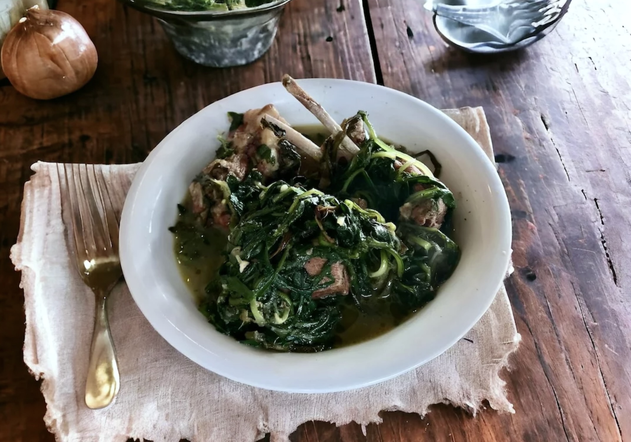 Jagnięcina z warzywami według przepisu kuchni kreteńskiej to niezwykle proste i pyszne danie. Mięso należy dusić we własnym sosie, a następnie dodać doń hortę lub podać ją osobno jako dodatek. Horta to zbiorcza nazwa dzikich ziół występujących na wyspie. W zasadzie wszystko co strzępiaste i zielone można wrócić do worka z nazwą horta. Na Krecie wciąż jest sporo osób, które potrafią rozpoznać każdy krzaczek, znają jego nazwę, a także metody ich obróbki i sposoby konsumpcji. Jednym z popularniejszych ziół na wyspie jest stamnagathi, czyli odmiana cykorii. Jadą się ją solo, albo gotuje z mięsem. Tak jak w przepisie poniżej.