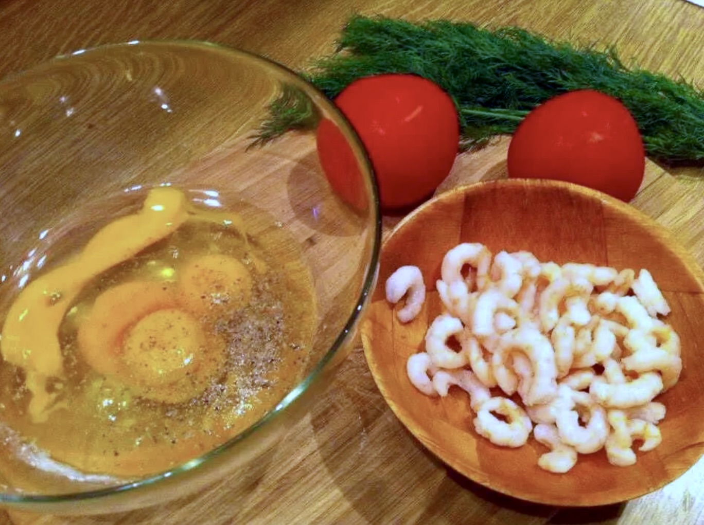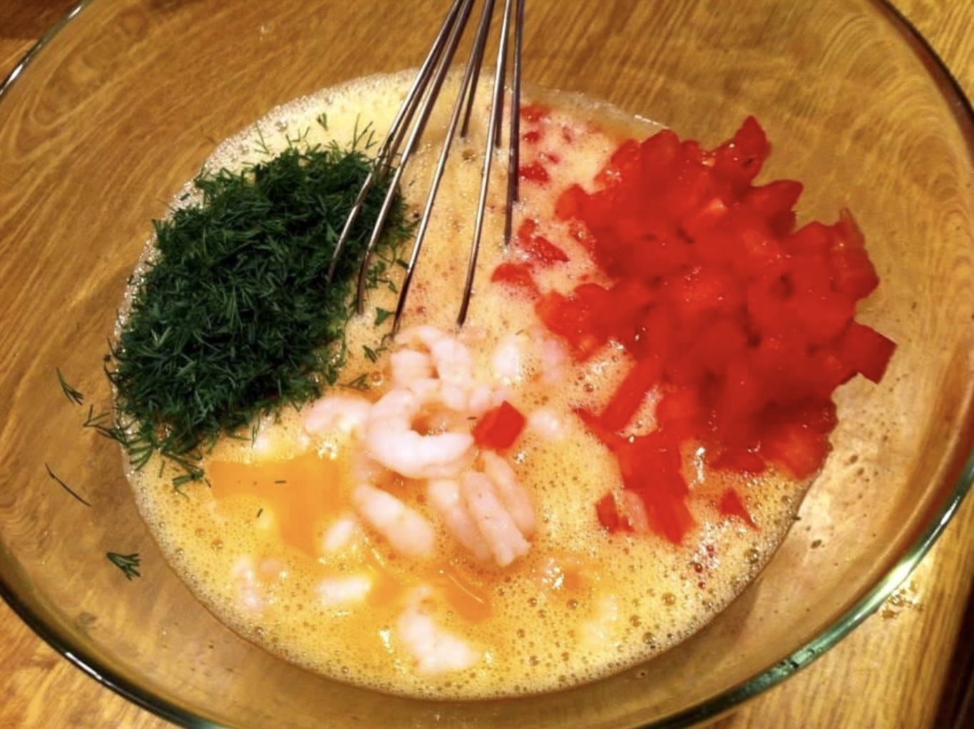 Do masy jajecznej dodaj posiekany koperek, pokrojone pomidory i krewetki.