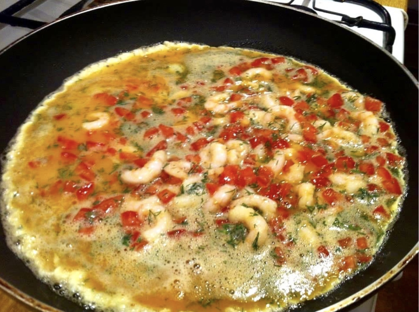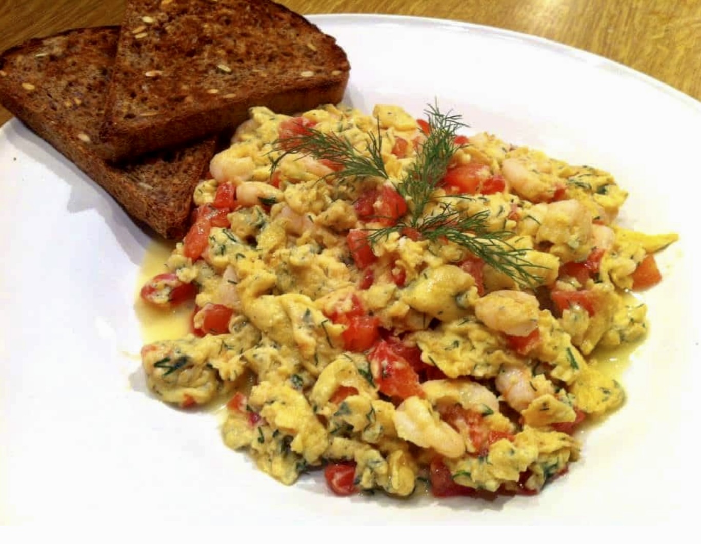 Jajecznica z krewetkami koktajlowymi i pomidorami
