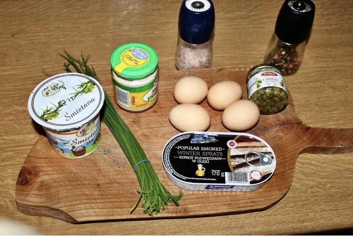Przygotowanie farszu: Otwórz puszkę ze szprotkami i wyjmij ryby, odsączając je z oleju. Szprotki posiekaj drobno (dowiedz się co to jest szprot). Kapary również drobno pokrój. Szczypiorek posiekaj.