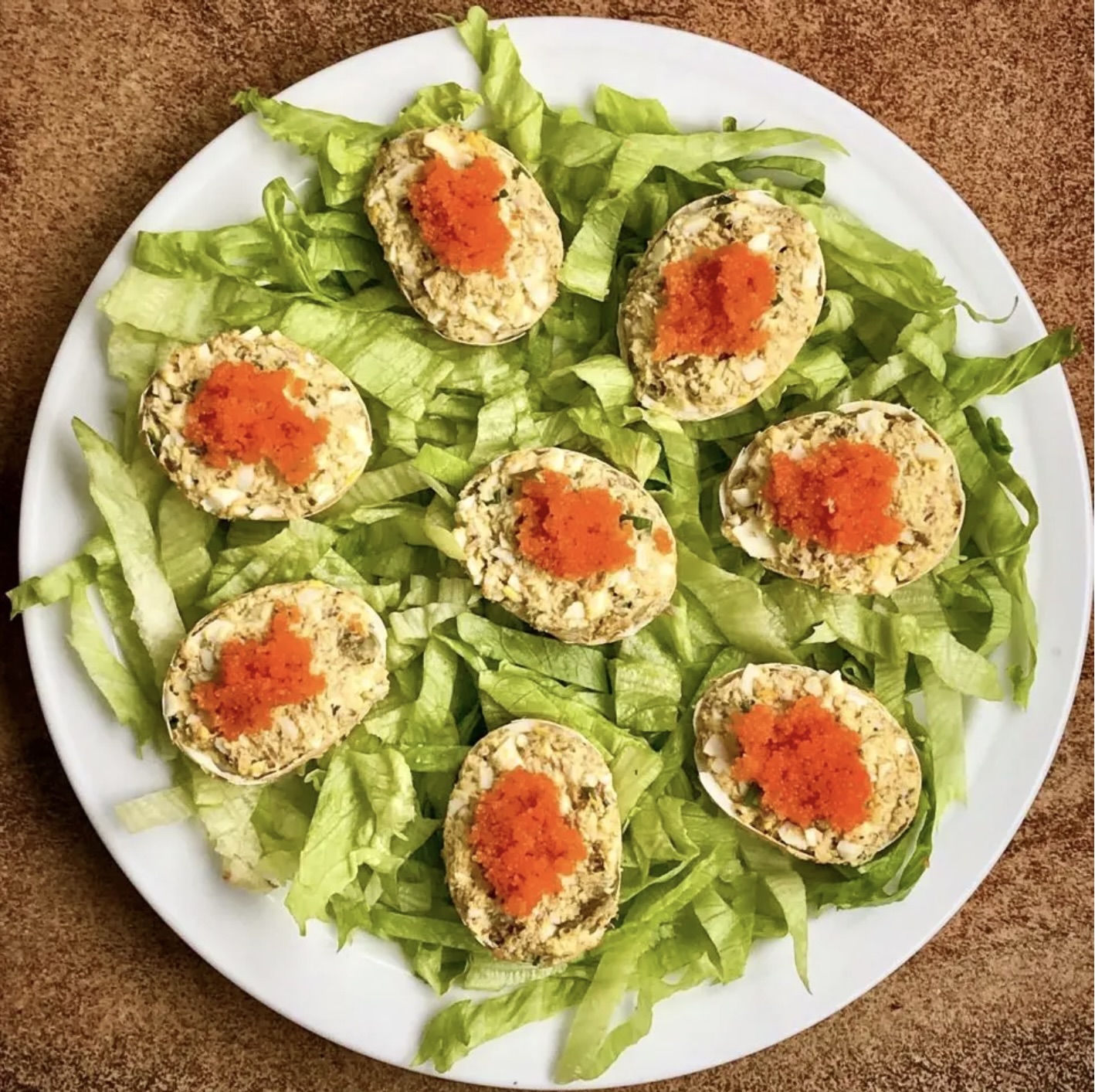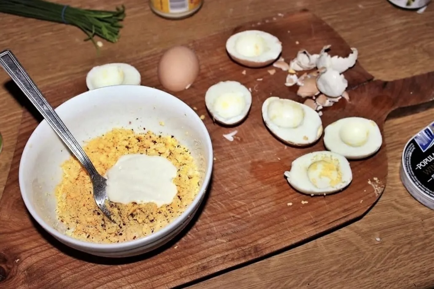 Faszerowanie i podanie: Tak przygotowanym farszem wypełnij dokładnie skorupki jajek. Podawaj z dodatkiem kawioru, wędzonego łososia lub ulubionego sosu na wierzchu.