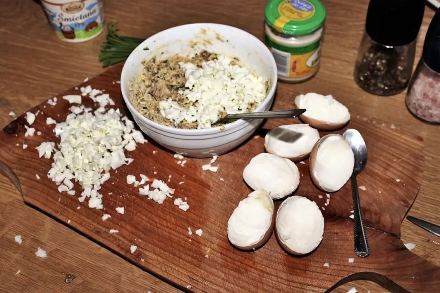 Białka: Z przepołowionych jajek wyjmij delikatnie małą łyżeczką białka jajek, tak aby nie naruszyć skorupek. Białka jajek posiekaj drobniutko i dodaj do farszu ze szprotkami. Całość dobrze wymieszaj.