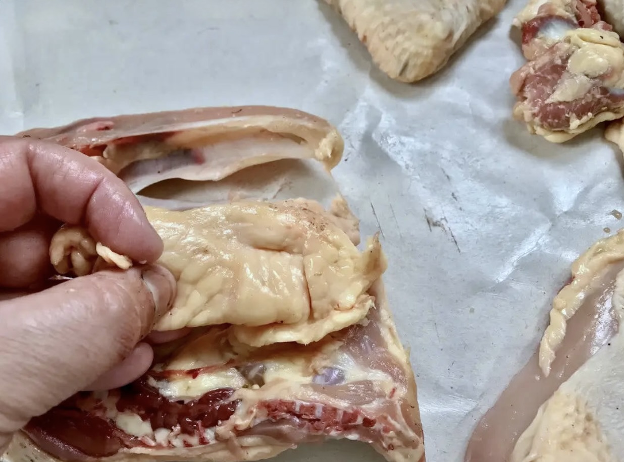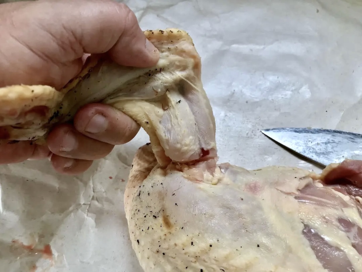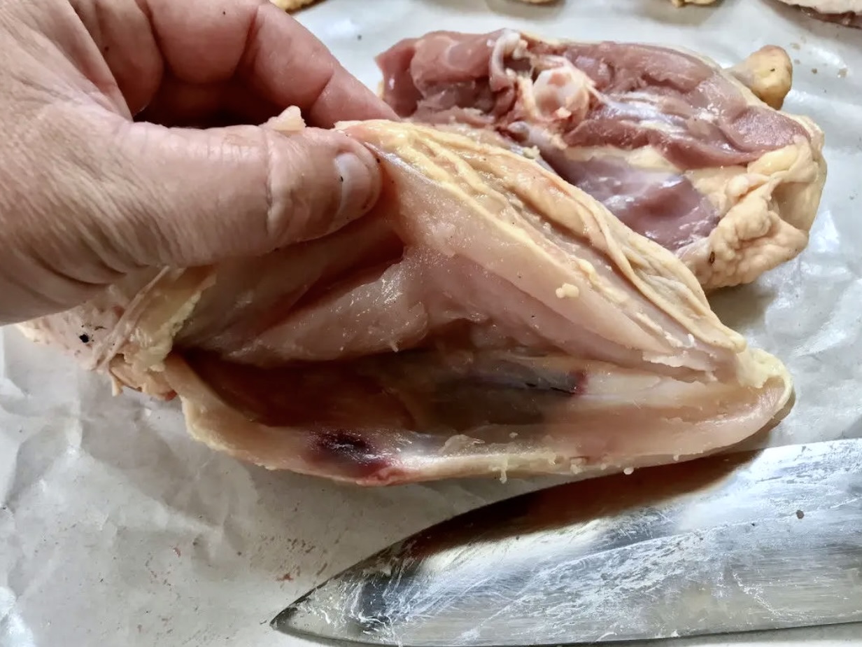 Zdobądź połowę porządnego kurczaka. Najlepiej od rzeźnika, albo prosto od baby ze wsi. Złap ptaka za nogę. Zwróć uwagę na połączenie jego jędrnej nogi z piersią. W tym momencie to właśnie to miejsce szczególnie powinno Cię zainteresować. Najpierw natnij nożem skórę, a następnie przetnij mięsień pomiędzy udkiem, a piersią kurczaka. Teraz odwróć półtuszkę i delikatnie staraj się odłamać udko od piersi. Przeszkodę w postaci kości udowej albo przetnij nożem, albo sprytnie obetnij wokół.