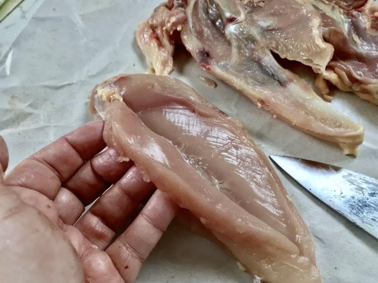 Oto piękne kurczęce udko. Odłóż je na bok, pora zająć się resztą ptaka. Prowadząc nóż wokół kości wykrój skrzydełko z korpusu kurczaka. Pora zająć się piersią z kurczaka. Prowadząc nóż wzdłuż mostka ptaka odkrój delikatnie pierś od korpusu kurczaka. Z wykrojonej piersi odkrój tzw. polędwiczkę. Z pozostałego korpusu kurczaka odkrój tzw. łój, czyli bardzo tłuste elementy ptaka. Nie będą Ci potrzebne.
