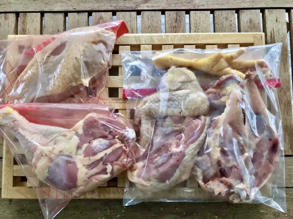 Wszystkie kawałki kurczaka spakuj osobno w woreczki i zamroź. Zauważ, ile dobrego jedzenia możesz przygotować dzieląc półtuszkę kurczaka według mojej propozycji. Z piersi z kurczaka możesz przyrządzić np. pyszny kurczak w sosie śmietanowym. Udko możesz podzielić i przyrządzić kurczak duszony z warzywami. Z korpusiku, kurzej łapki i skrzydełka przygotujesz fantastyczny wywar lub galaretka drobiowa. Część wywaru możesz przeznaczyć na przygotowanie dowolnego treściwego sosu.