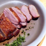 Podanie: Pokrój pierś w poprzek na plastry o grubości ok. 0,5 cm i polej sokami, które zebrały się podczas odpoczywania mięsa.