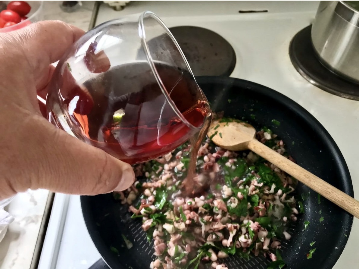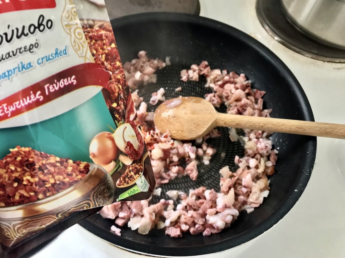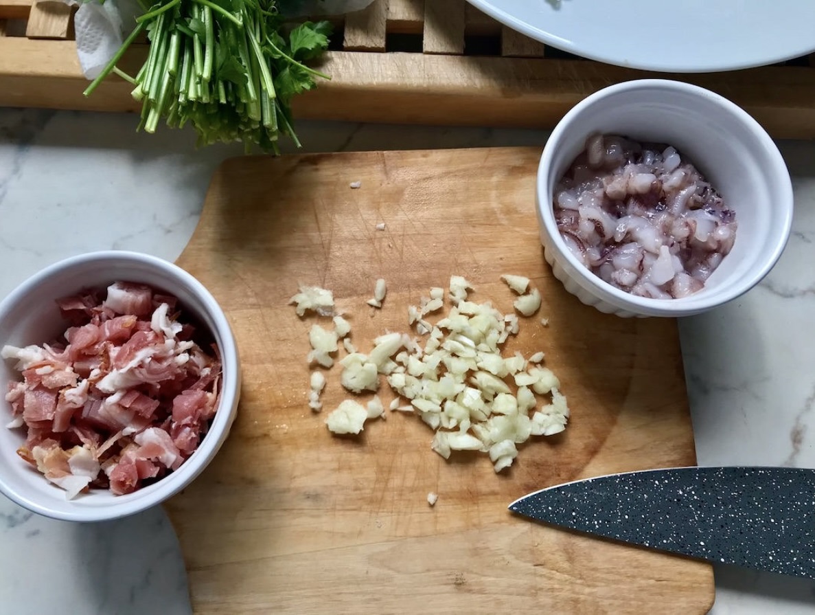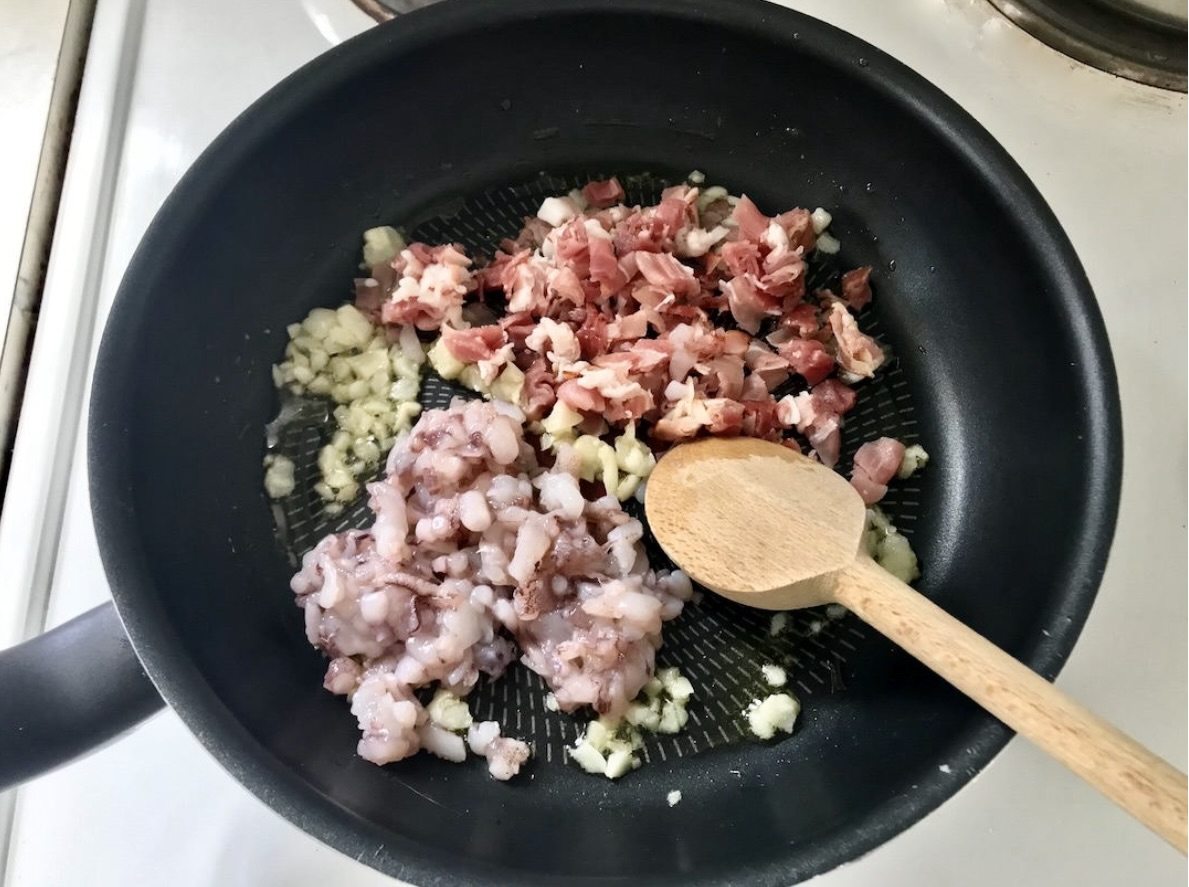 Następnie wrzuć szynkę i posiekane kalmary.
