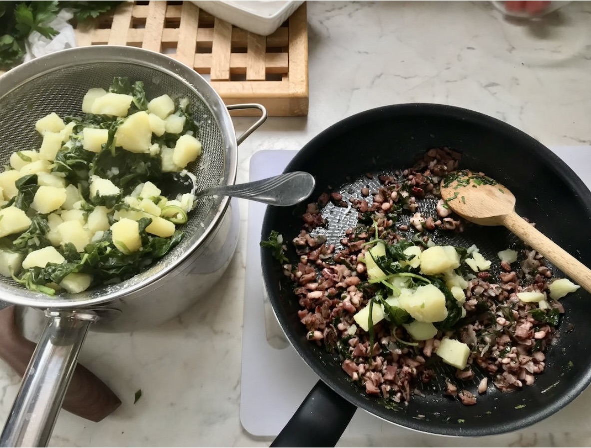 Posiekaj sporo natki pietruszki i dodaj do farszu na patelni.