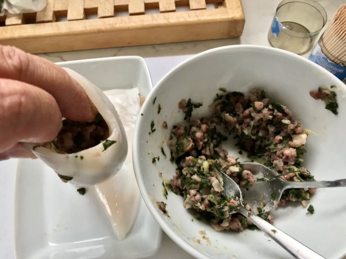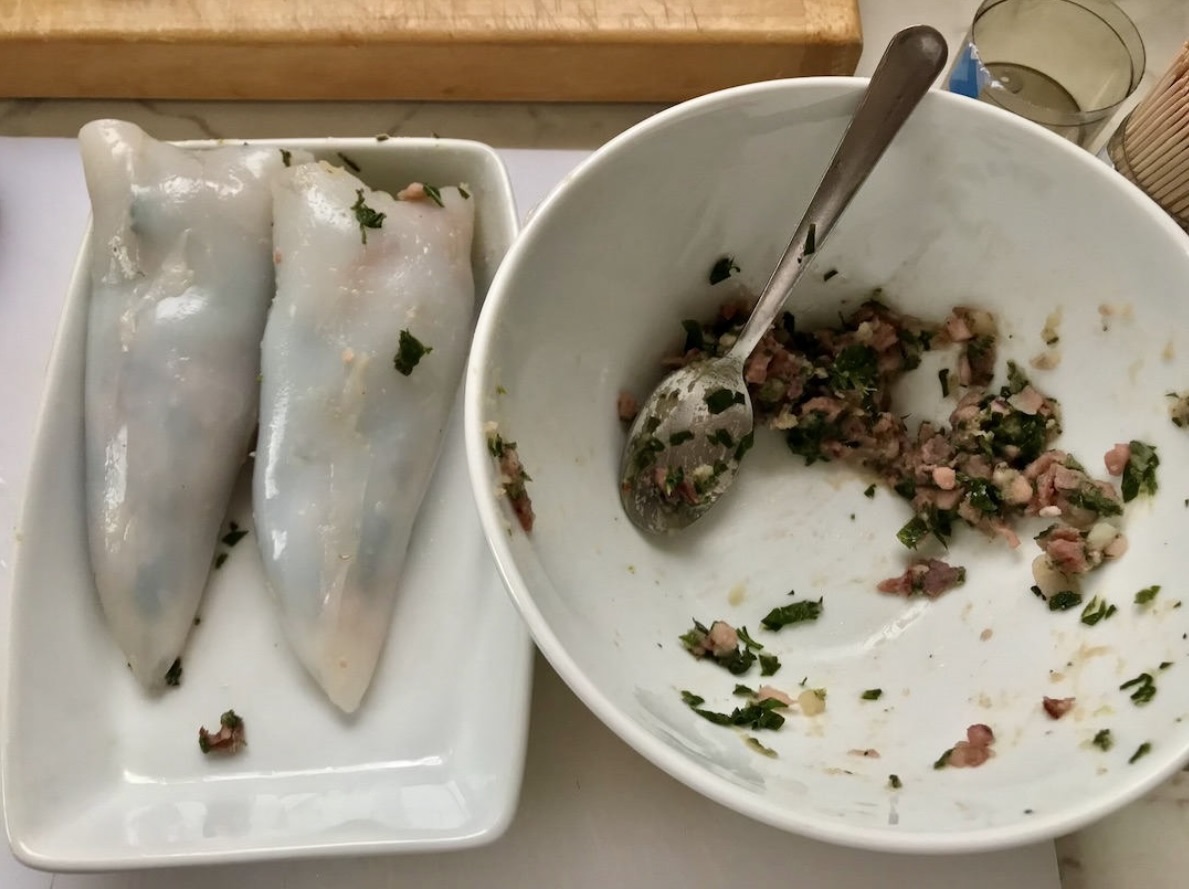 Kalmary faszerowane szynką przygotowanie farszu
