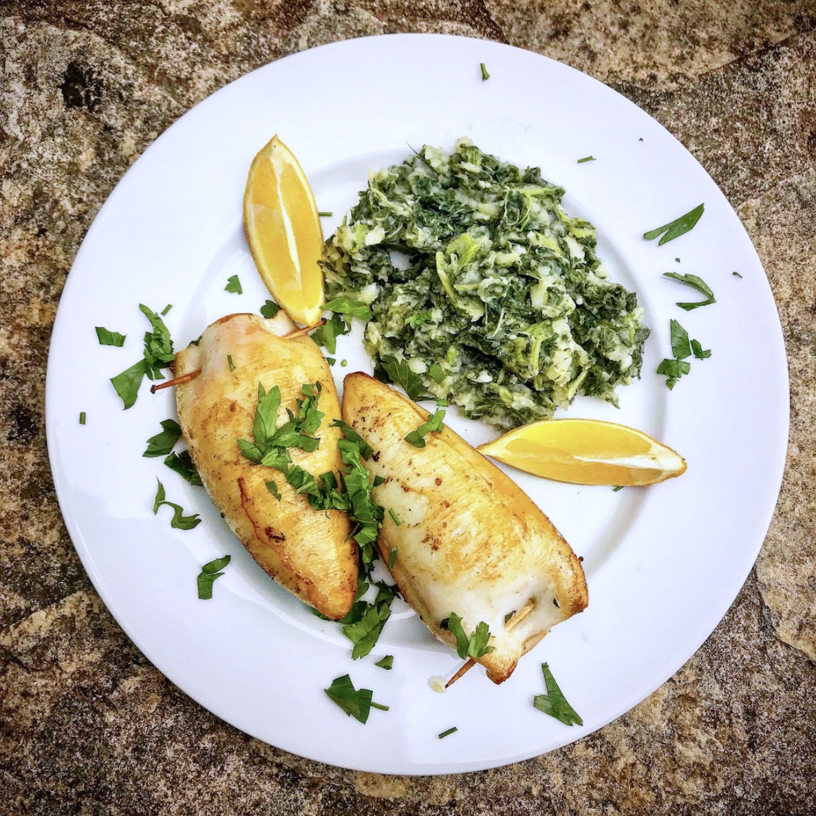 Kalmary faszerowane szynką podawaj od razu, z cząstkami cytryny, posypane natką pietruszki. Najlepiej smakują podane z gotowaną BLITVĄ z ziemniakami (blitva z ziemniakami przysmak chorwacki).