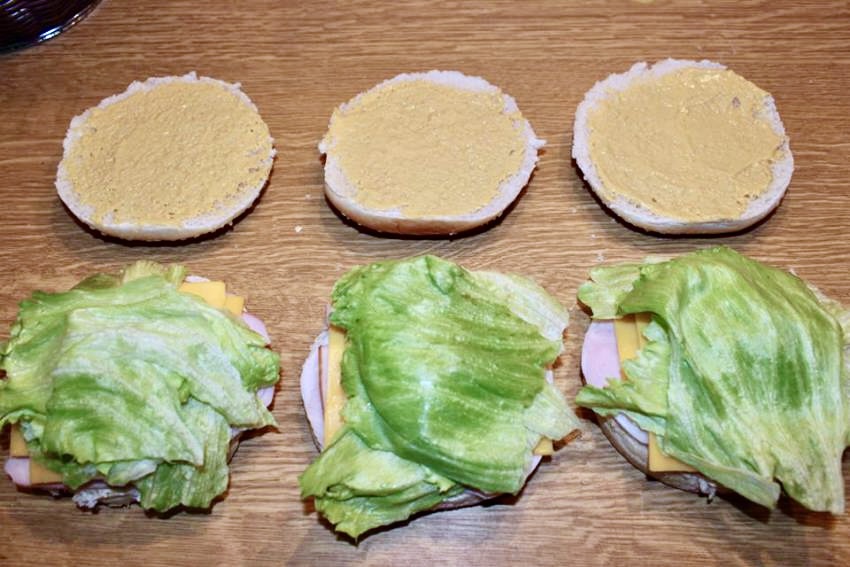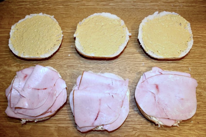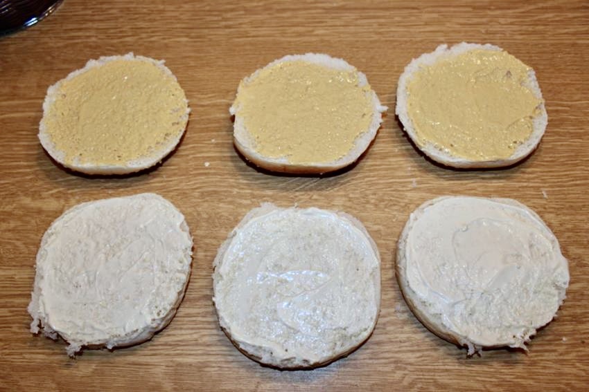 Smarowanie bułek: Przekrój bułki na pół. Dolną część każdej bułki posmaruj 1 łyżką majonezu, a górną mniejszą ilością musztardy Dijon.