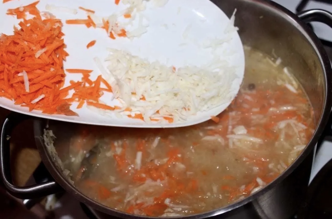 Do garnka z miękką kapustą wrzuć starte marchewkę i pietruszkę.