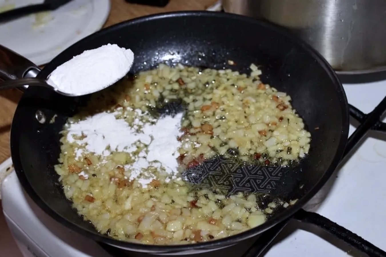 Wsyp 2 płaskie łyżki mąki i ciągle mieszając, lekko ją podsmaż (tzw. jasna zasmażka).