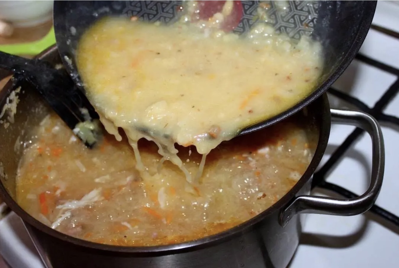 Następnie wlej na patelnię 2 chochelki zupy, a następnie ciągle mieszając, połącz wszystkie składniki w gładką masę.