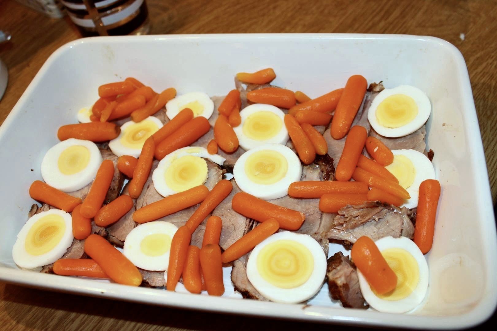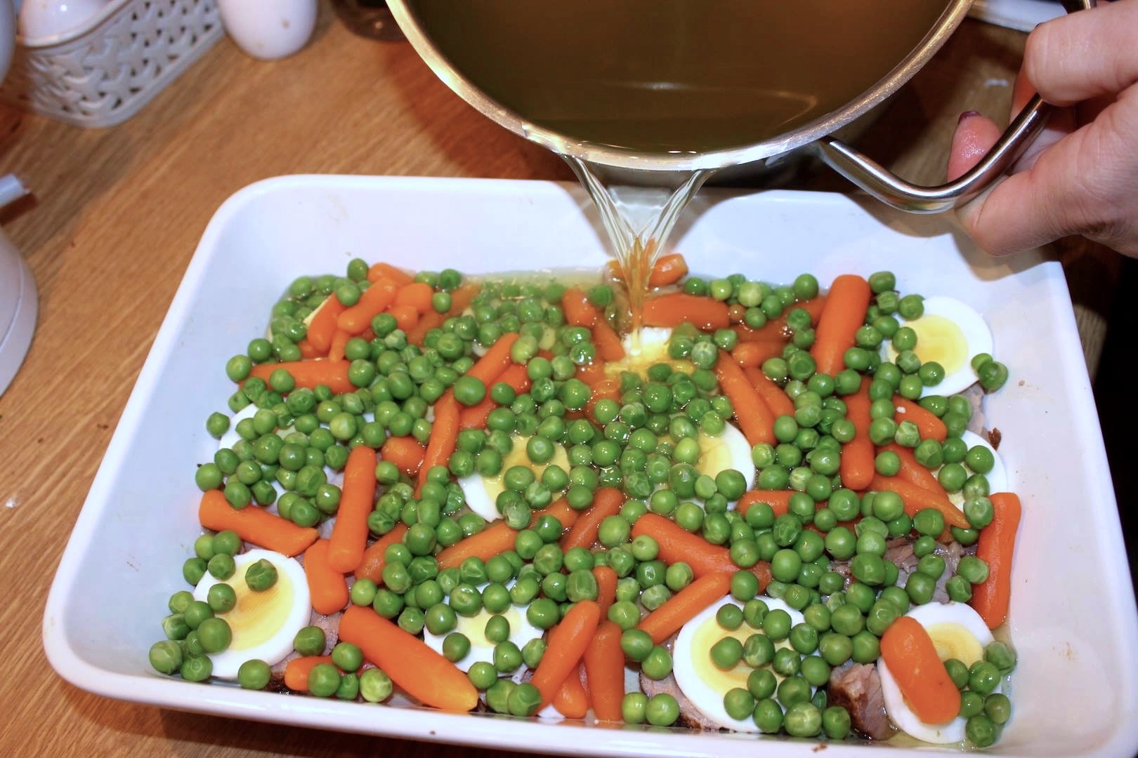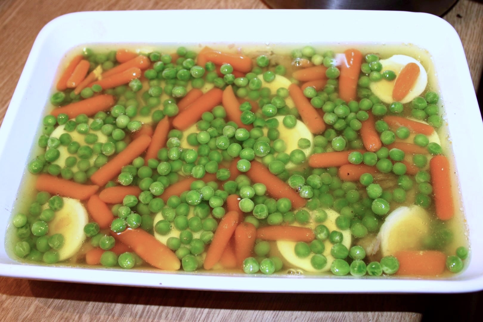 Układanie: Na dnie naczynia rozłóż cienkie plasterki upieczonego karczku, plasterki jajka oraz ugotowaną marchewkę. Na wierzchu równomiernie rozsyp groszek.