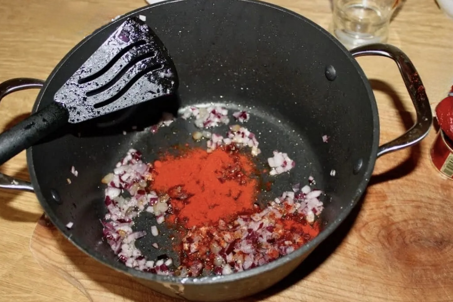 Zdejmij garnek z gazu, wsyp mieloną, słodką paprykę (2 łyżeczki), dokładnie wymieszaj.