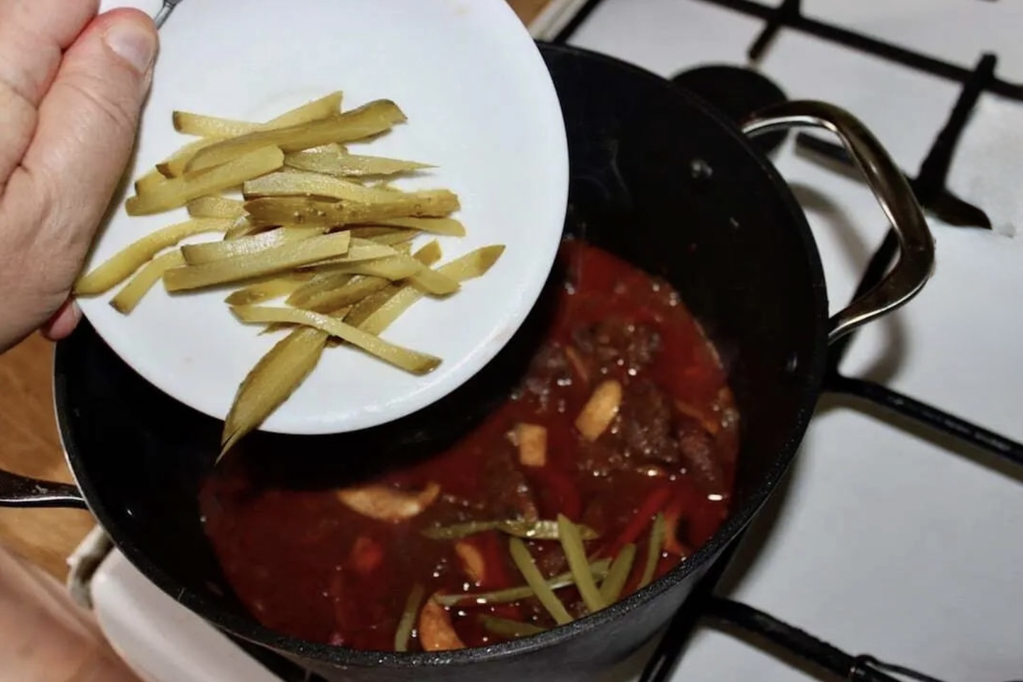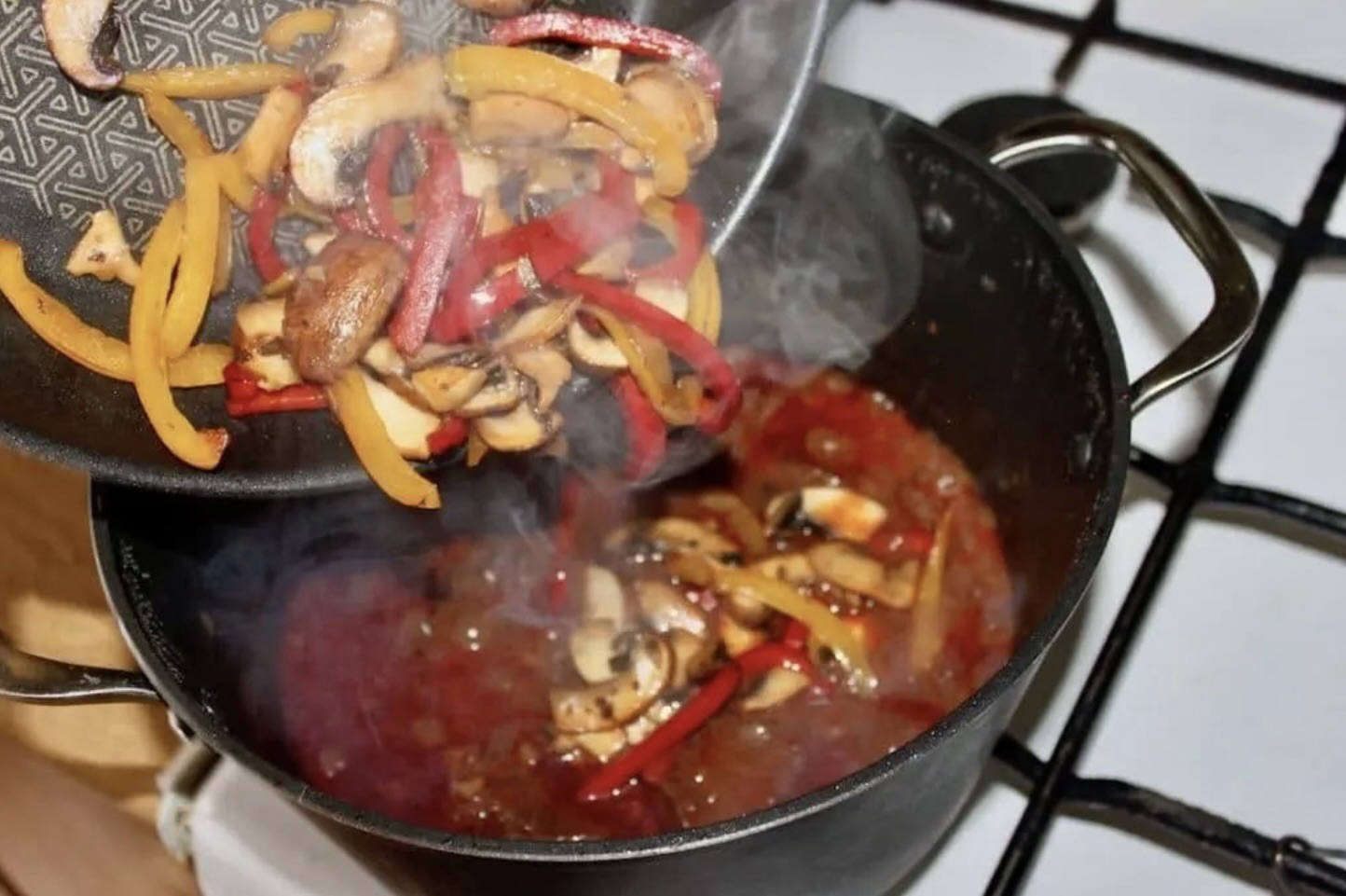 Gdy mięso jest miękkie, krótko przesmaż warzywa (papryki i pieczarki) na minimalnej ilości smalcu i dodaj je do gulaszu.