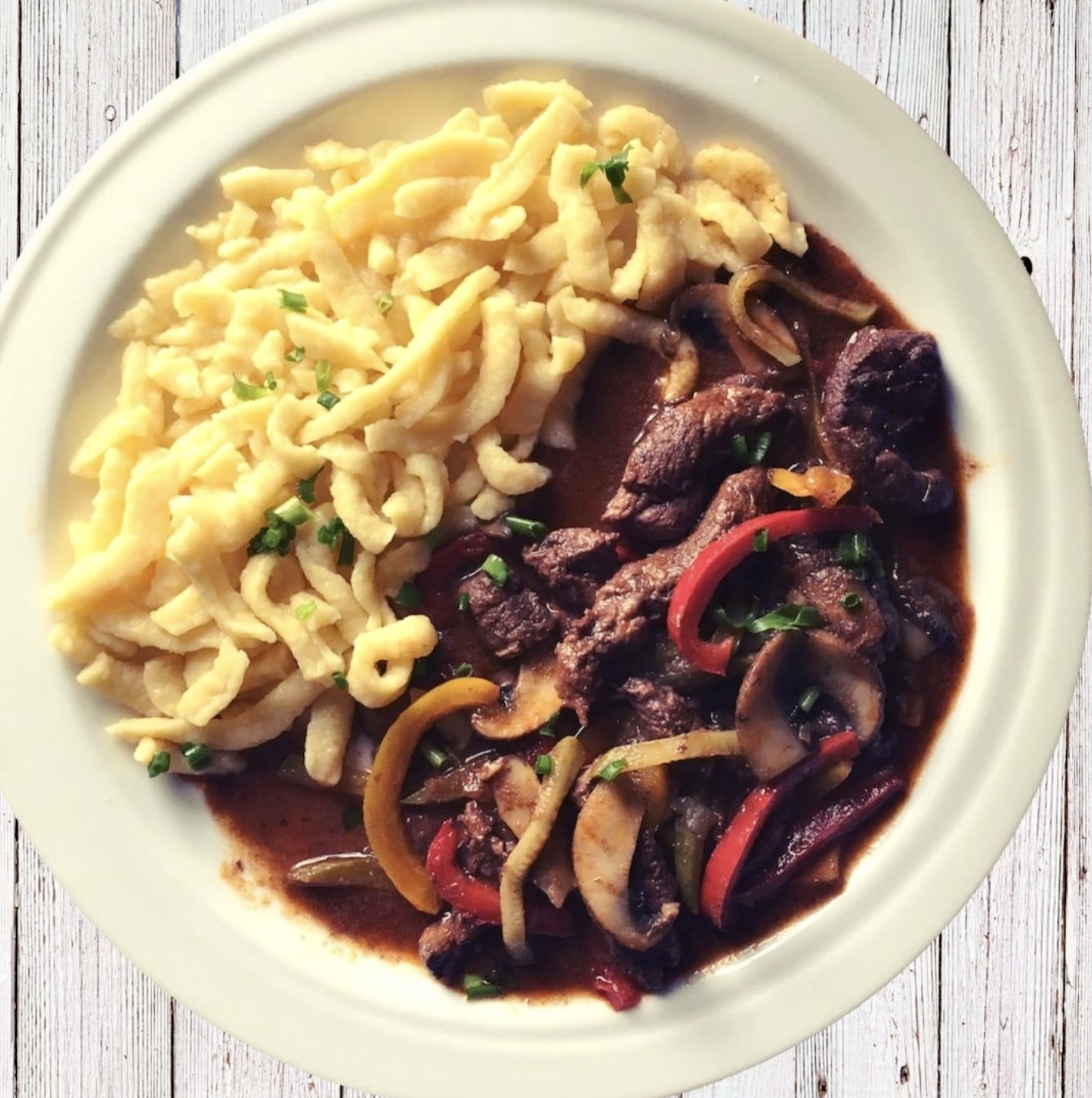 Gulasz świetnie smakuje z kluskami, puree, makaronem szpecle lub penne, a także z kaszą.