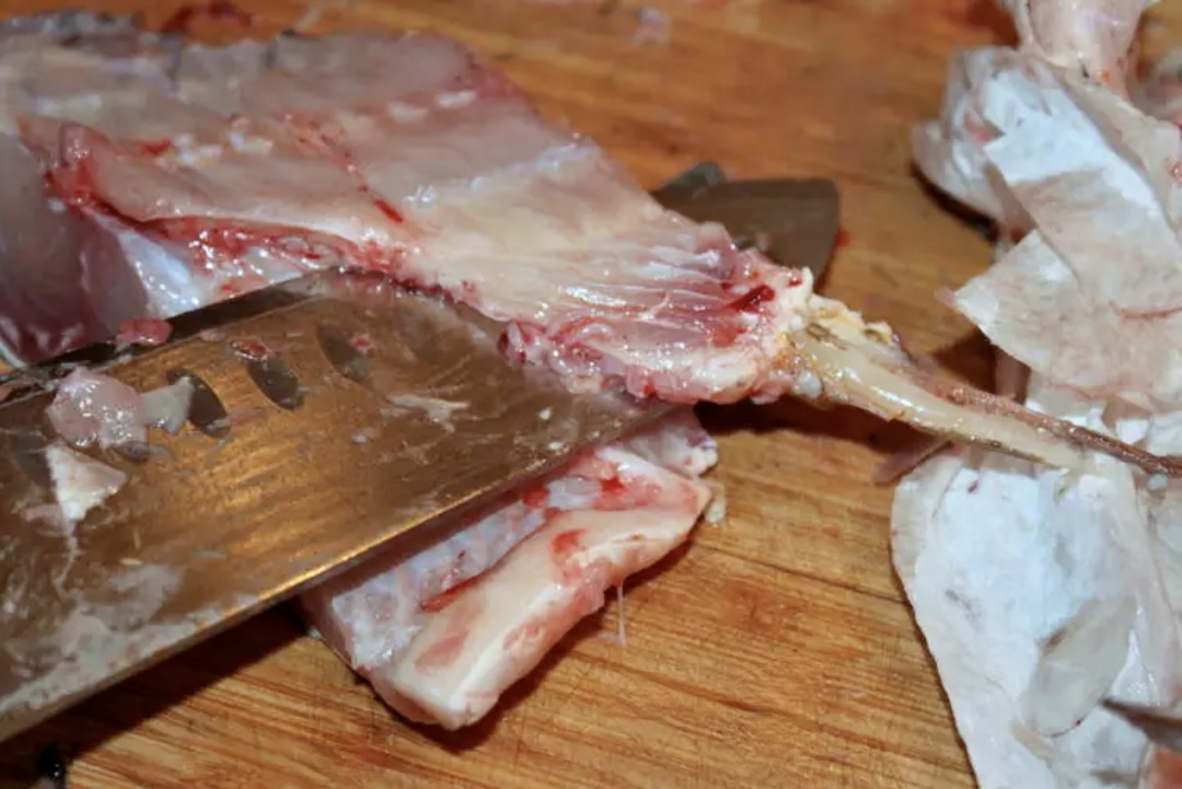 Rybę pokrój w dzwonka. Z każdego dzwonka wykrój dwa filety odkrawając je od kręgosłupa ryby po obu jego stronach. Każdy z filetów połóż na desce do krojenia. Prowadząc prostopadle do filetów duży nóż pozbaw filety pozostałych kawałków kręgosłupa i ości.