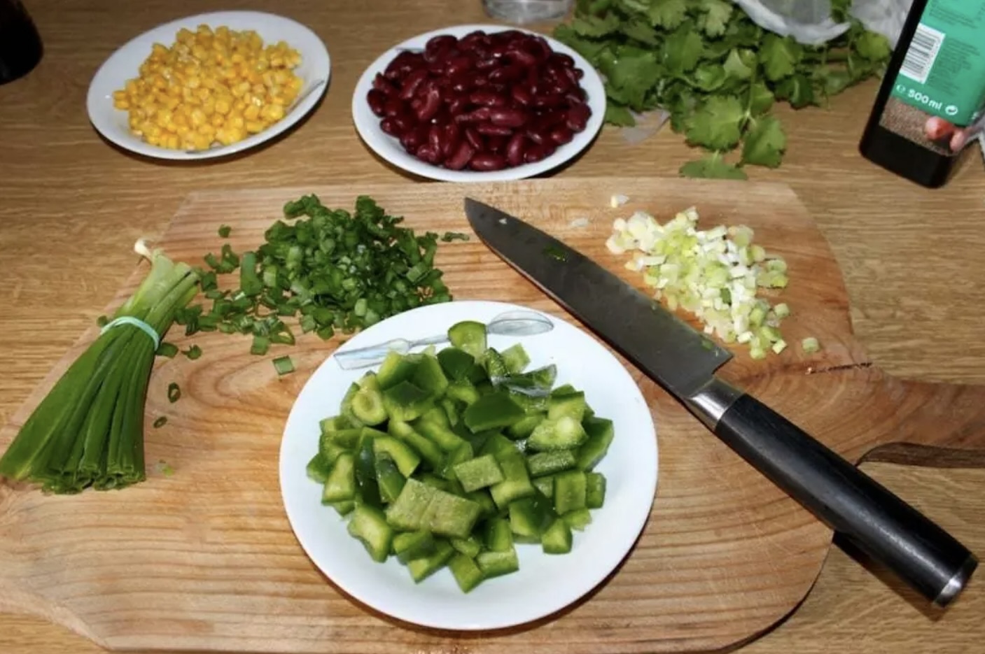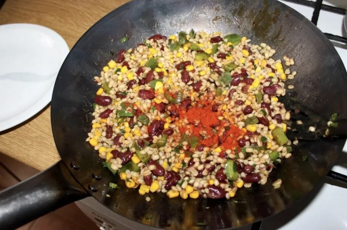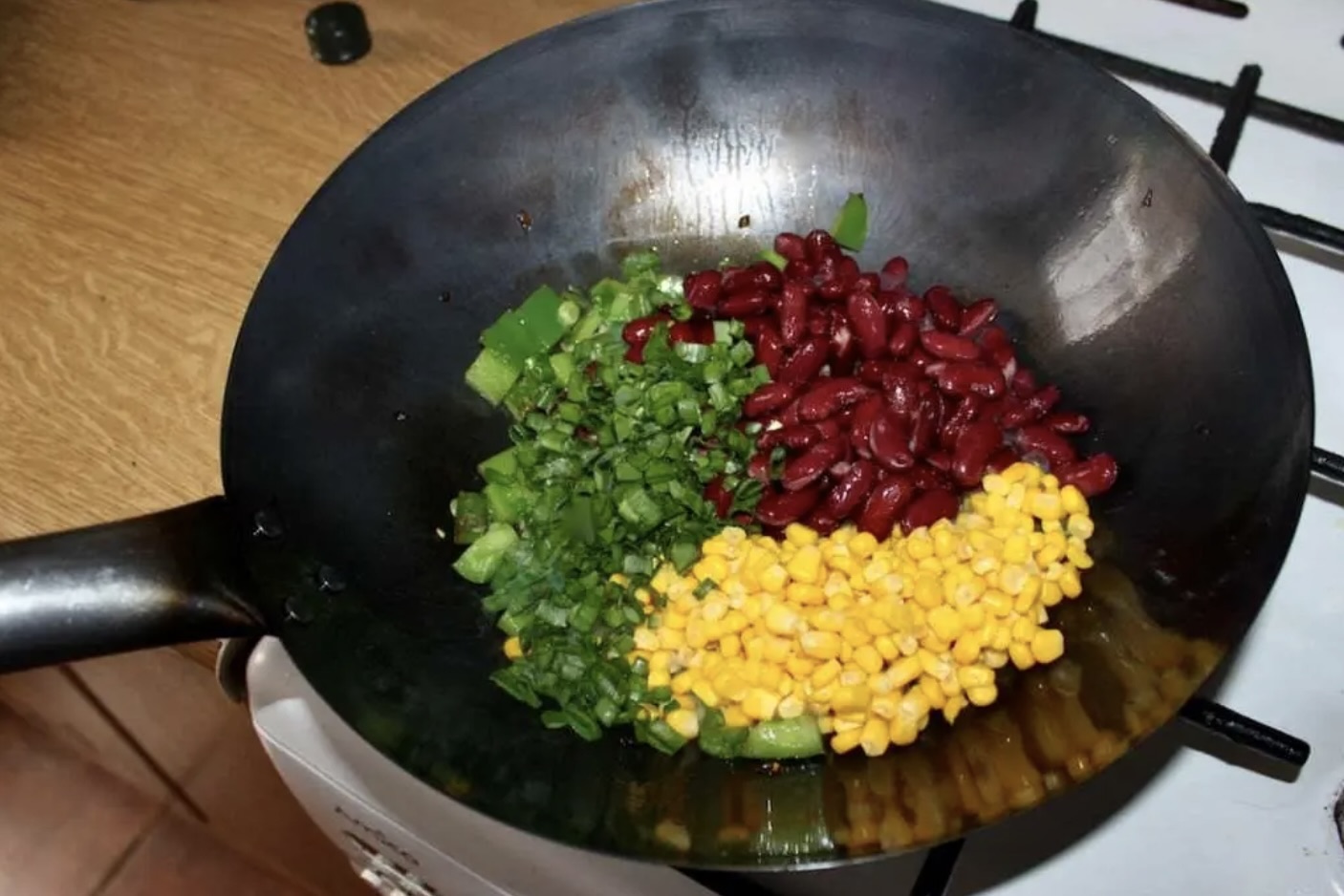 Następnie dodaj odsączoną fasolę, kukurydzę i zielone części dymki. Smaż maksymalnie dwie minuty, często mieszając.