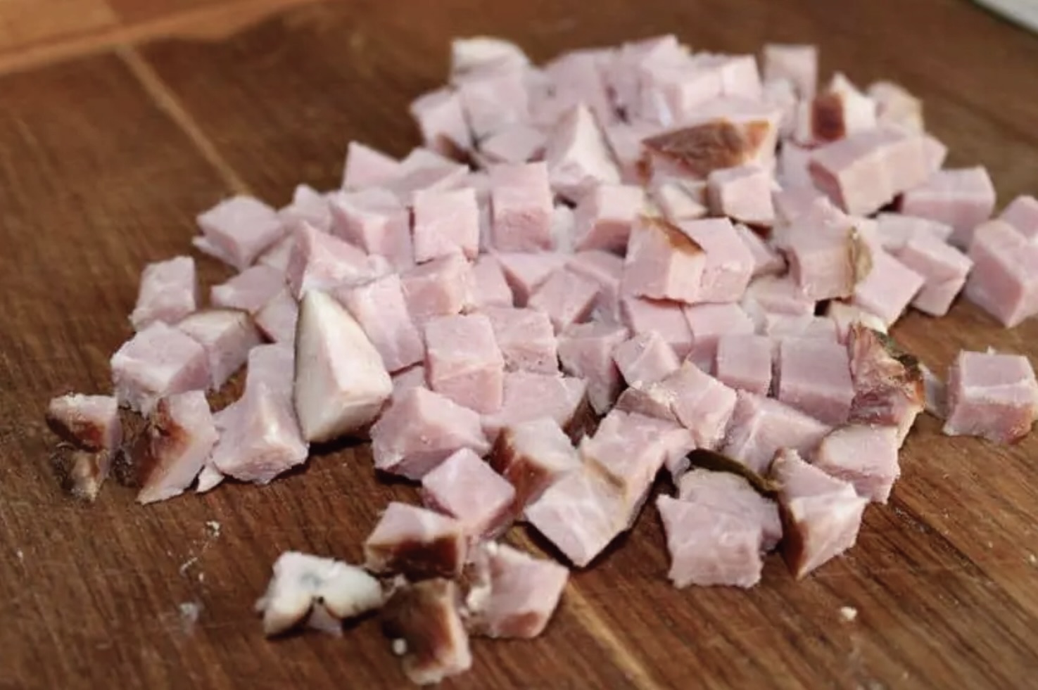 Szynka gotowana: około 150 g, dobrej jakości, o mocnym, wędzonym aromacie