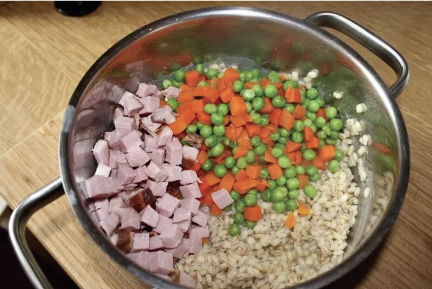 Dodaj do kaszy pokrojoną szynkę oraz ugotowane warzywa.