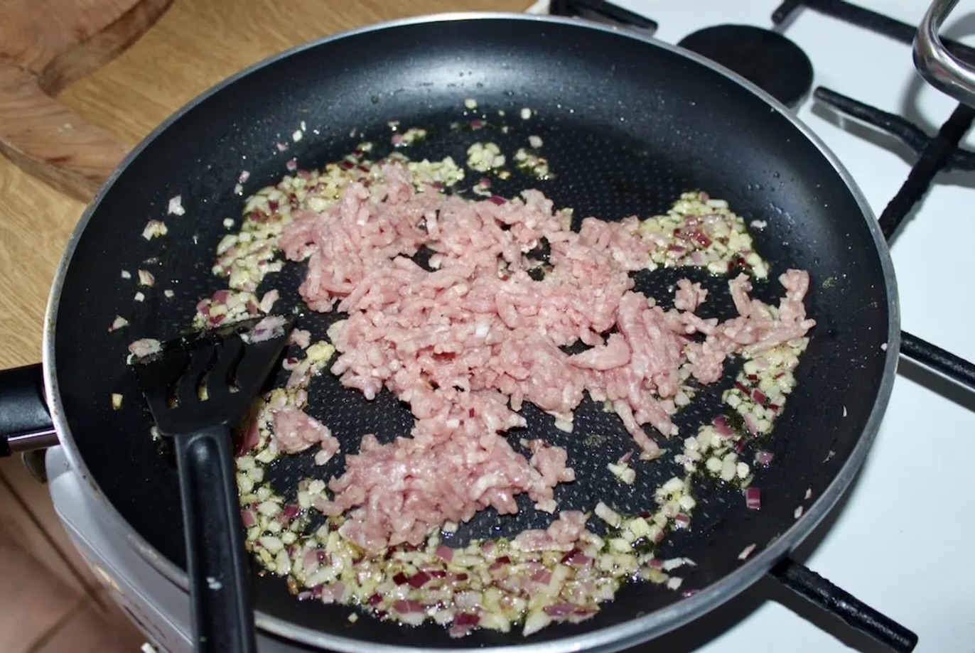 Smażenie mięsa: Na patelni rozgrzej trochę oliwy i wrzuć posiekaną cebulę. Zeszklij ją, a następnie dodaj zmiażdżony ząbek czosnku. Dorzuć mieloną wieprzowinę i smaż razem około 5 minut, aż mięso się dobrze wysmaży.
