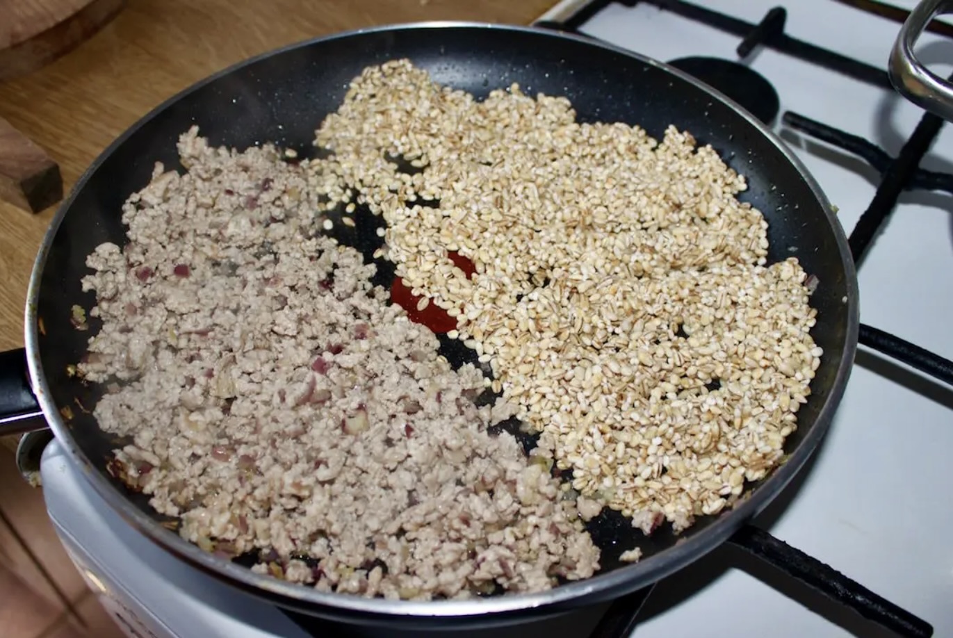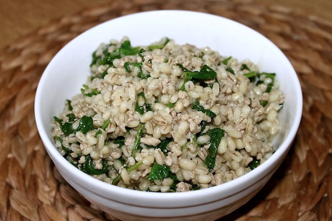 Kasza z mięsem wieprzowym i szpinakiem (Orzotto)