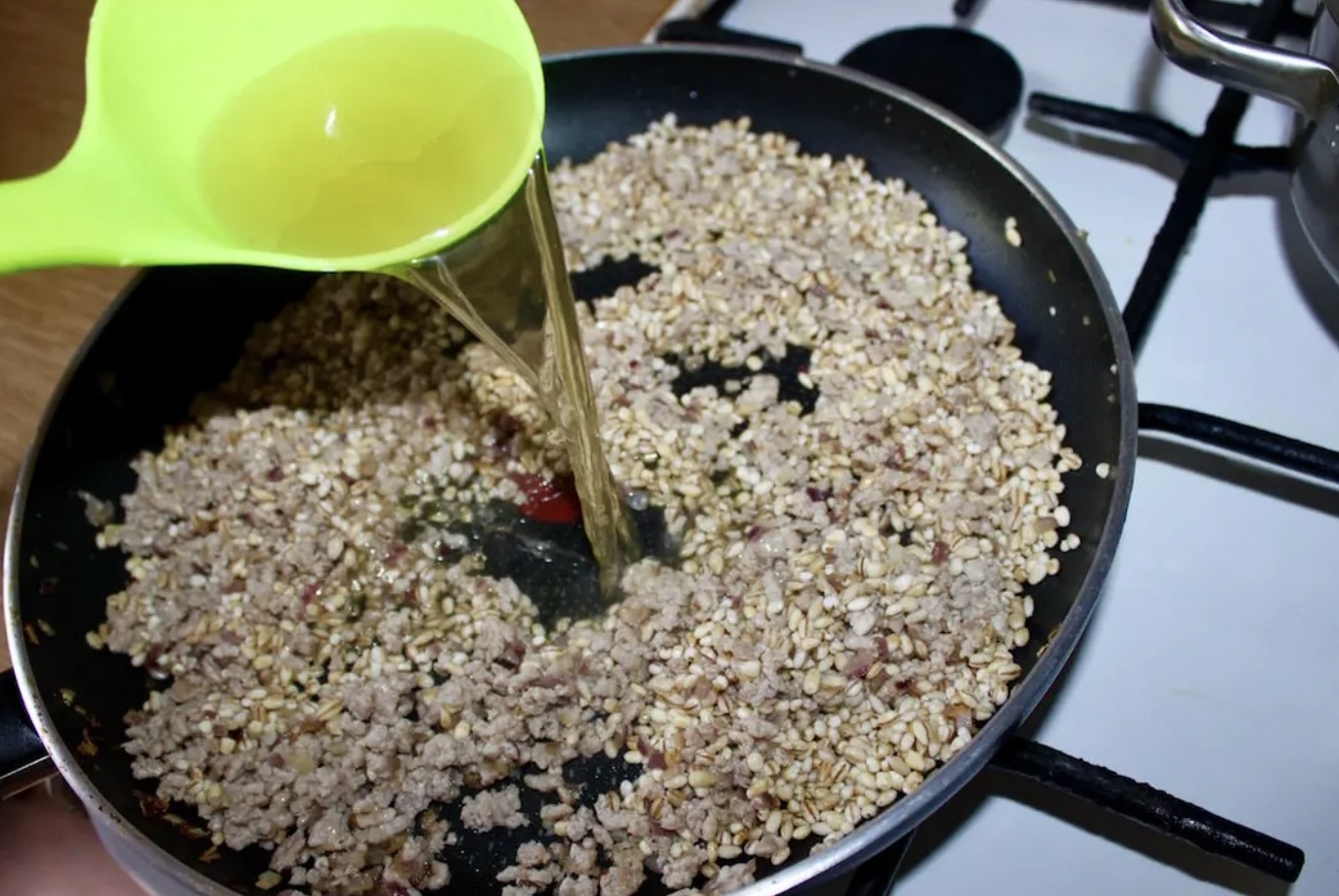 Dodanie kaszy: Odsuń wstępnie przesmażone mięso na bok patelni i wrzuć obok pęczak. Smaż mięso i kaszę oddzielnie około minuty. Następnie wymieszaj całość i smaż, ciągle mieszając, przez 2 minuty.